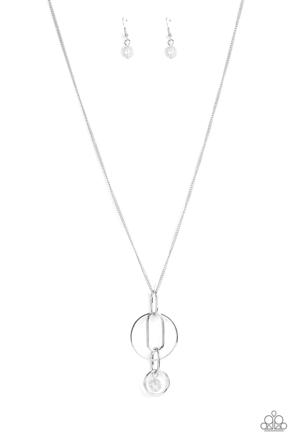 A collection of oval and round silver links, embellished with a faceted white bead suspended inside the bottom most round frame, coalesce into a flirty charm as it sways from the bottom of a lengthened dainty silver chain. Features an adjustable clasp closure.