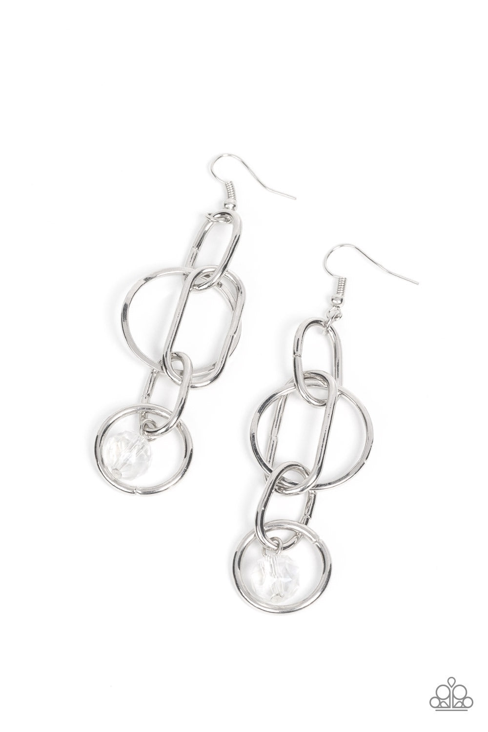 A collection of oval and round silver links, embellished with a faceted white bead suspended inside the bottom most round frame, coalesce into a flirty charm as it sways from the ear. Earring attaches to a standard fishhook fitting.