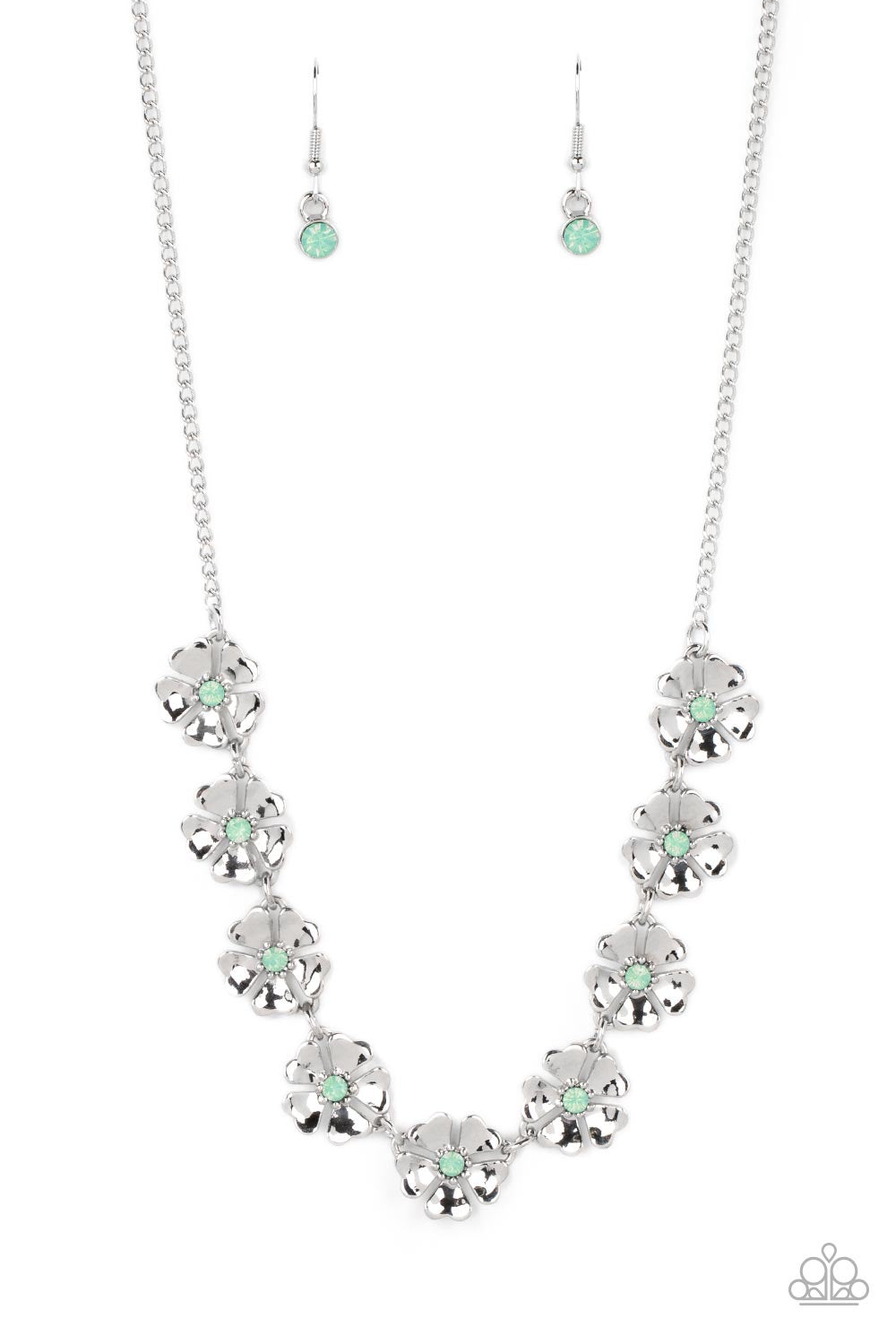 Heart-shaped silver petals bloom from opaque Basil rhinestone centers, creating colorful flowers. The dainty floral frames delicately dance below the collar, connecting into a whimsical centerpiece. Features an adjustable clasp closure.
