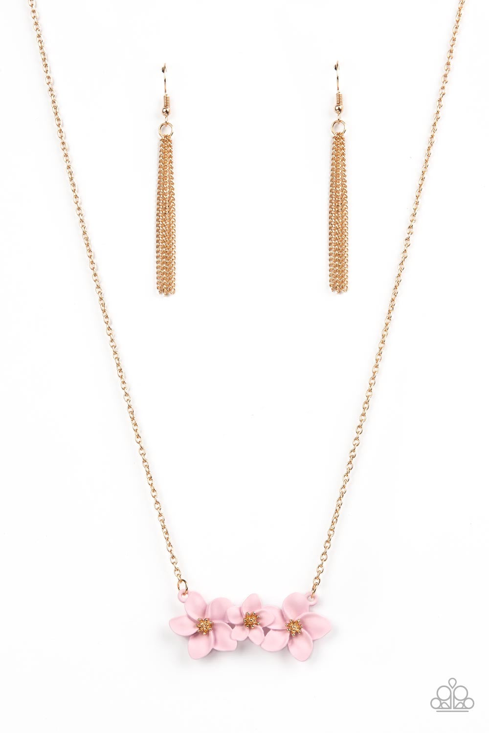Featuring pronged gold centers, a trio of overlapping pink flowers in a flawless matte finish delicately connects to a dainty gold chain below the collar for a whimsical floral fashion. Features an adjustable clasp closure.