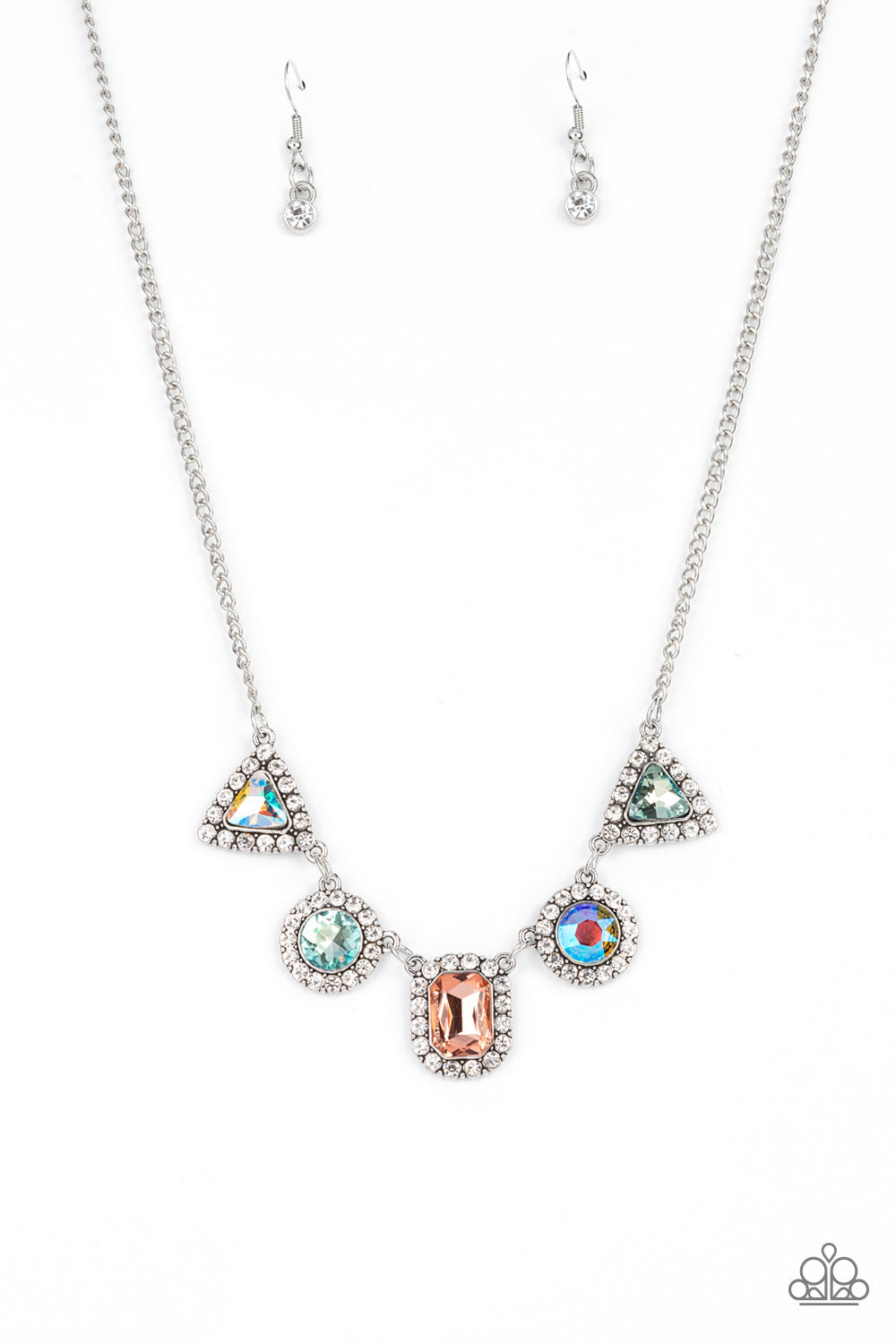 Featuring triangular, round, and emerald style cuts, an iridescent collection of multicolored rhinestones are bordered in glassy white rhinestones as they delicately link below the collar for a sparkly statement. Features an adjustable clasp closure.