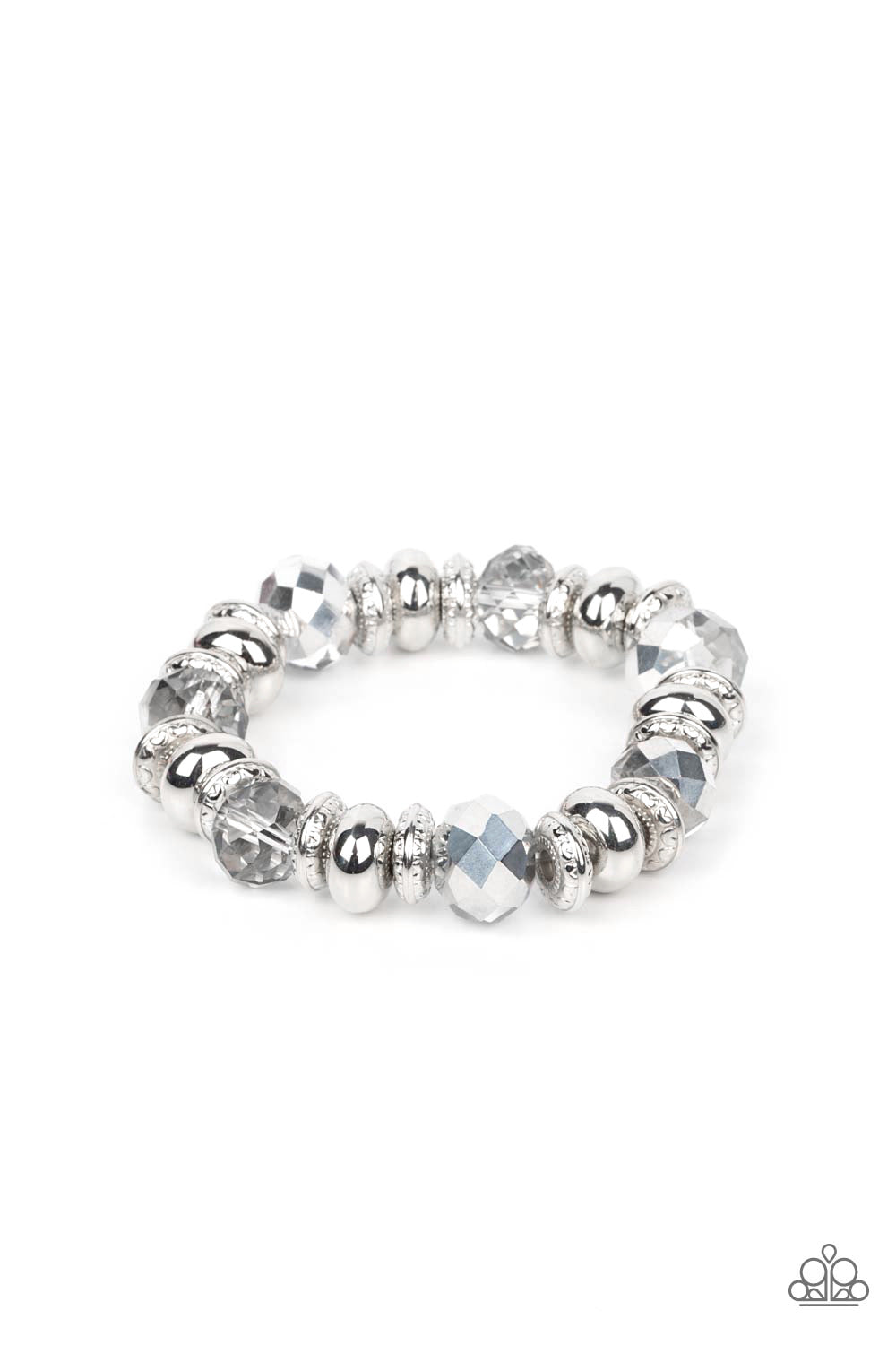 An oversized assortment of textured silver rings, smooth silver beads, and metallic-flecked crystals are threaded along stretchy bands around the wrist for a glitzy finish.