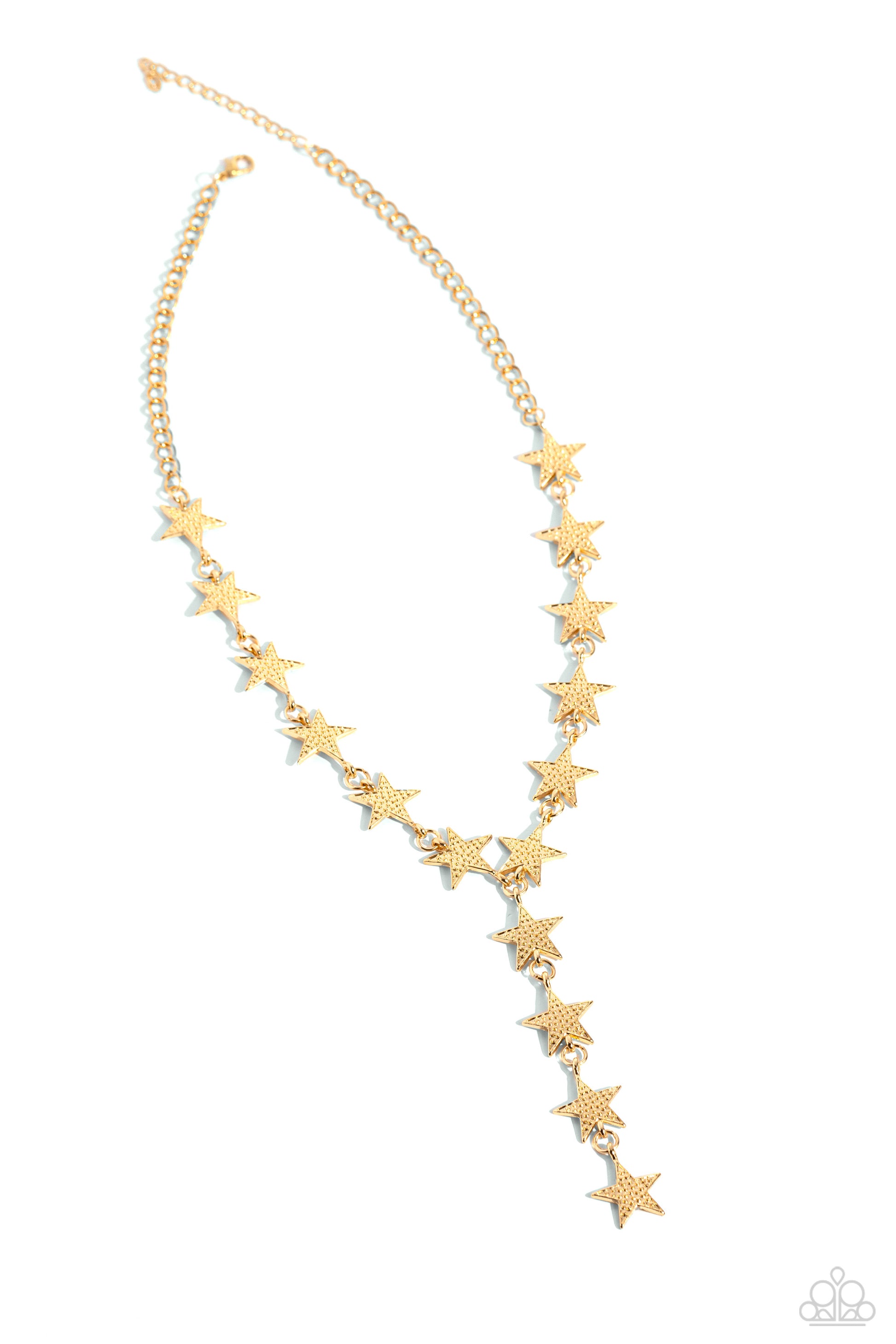Featuring a studded motif, a collection of gold stars interlock below the collar on a classic gold chain, glistening into an edgy extended pendant for a stellar-making finish. Features an adjustable clasp closure.