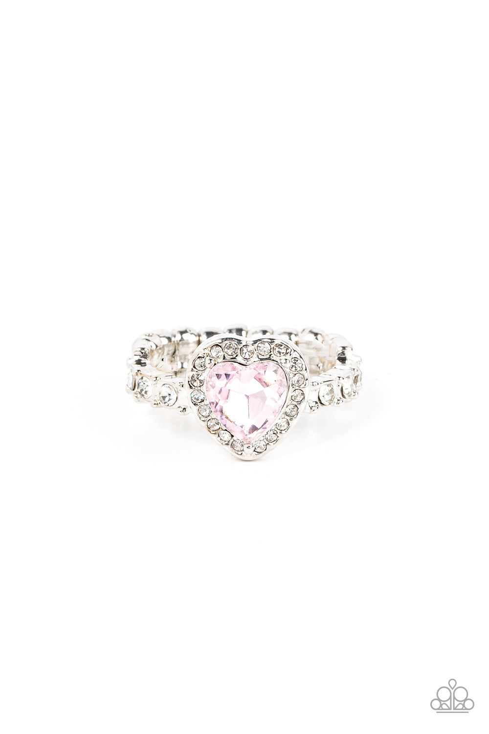 Bordered in a glassy frame of dainty white rhinestones, a pink heart shaped gem sparkles atop a silver band dotted in brilliant white rhinestones for a romantic finish. Features a dainty stretchy band for a flexible fit.