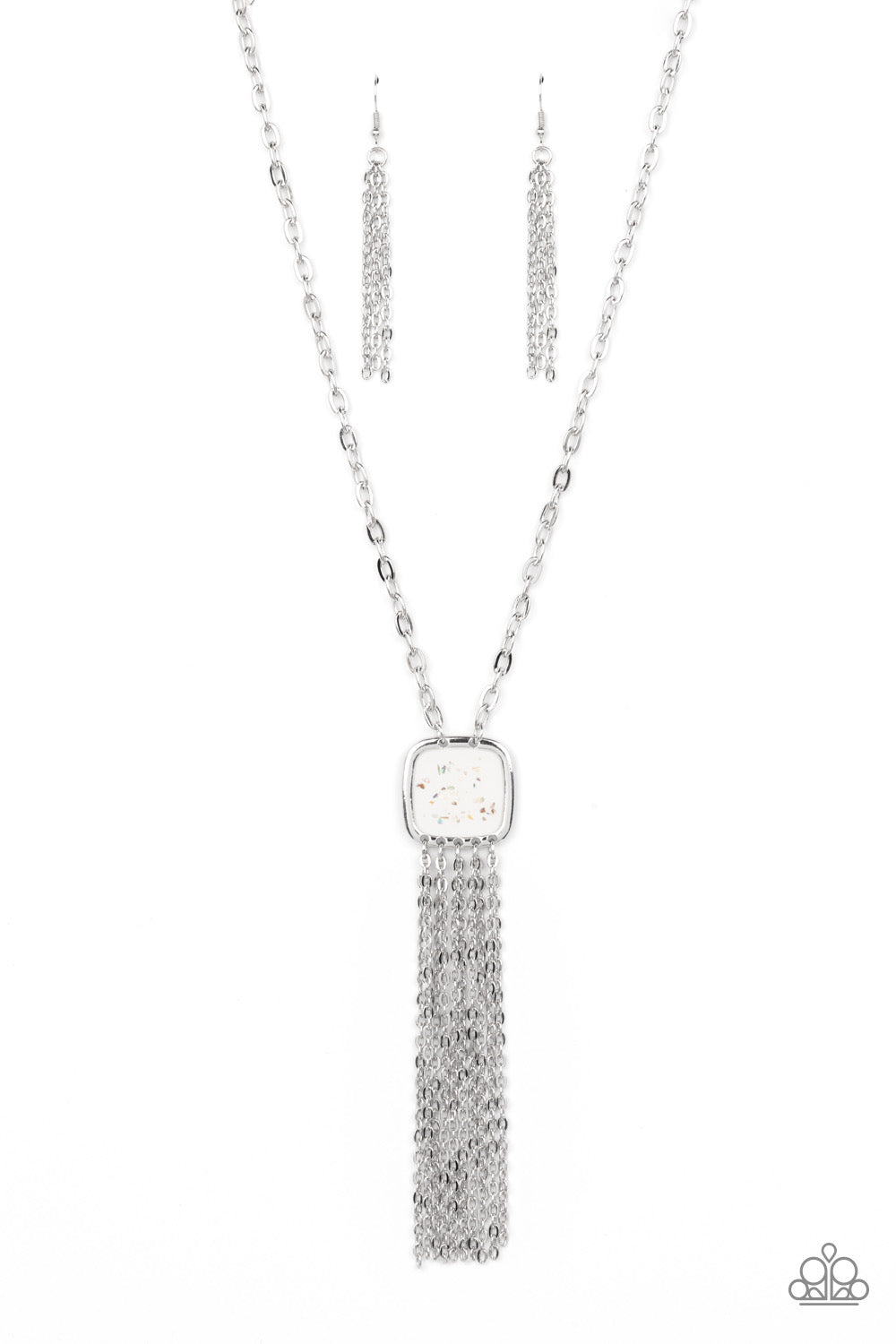 Flecked in shell-like iridescence, a white painted square silver frame swings from the bottom of a bold silver chain. A matching curtain of silver chains streams out from the bottom of the colorful pendant, adding a playful movement. Features an adjustable clasp closure.