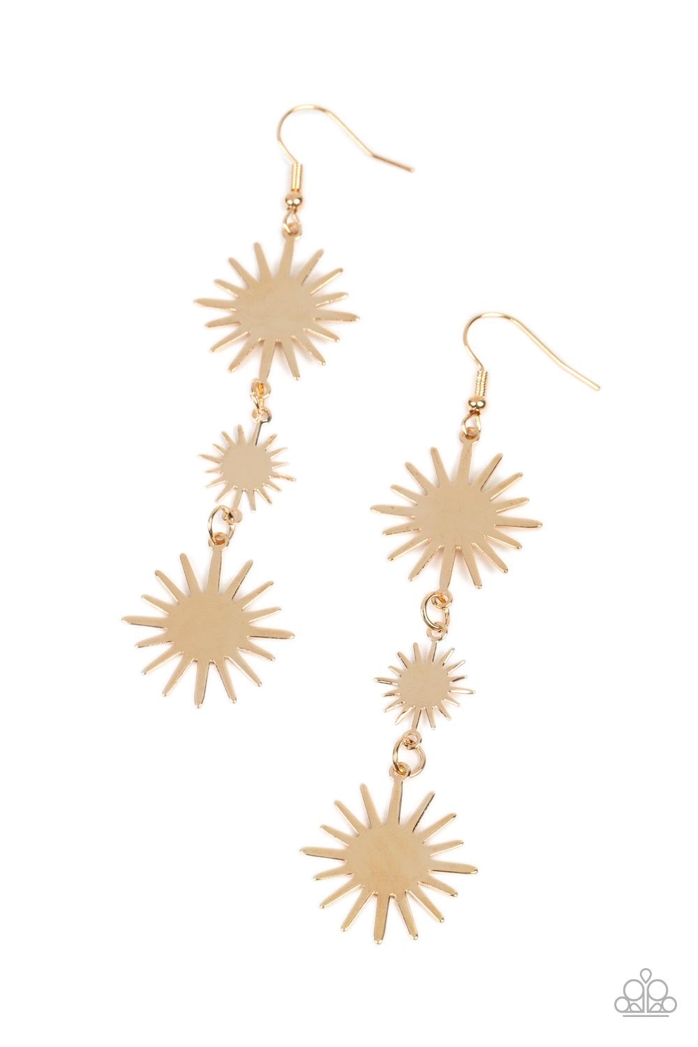 Varying in size, a trio of starry gold sunburst frames delicately links into a lengthened lure for a celestial vibe. Earring attaches to a standard fishhook fitting.