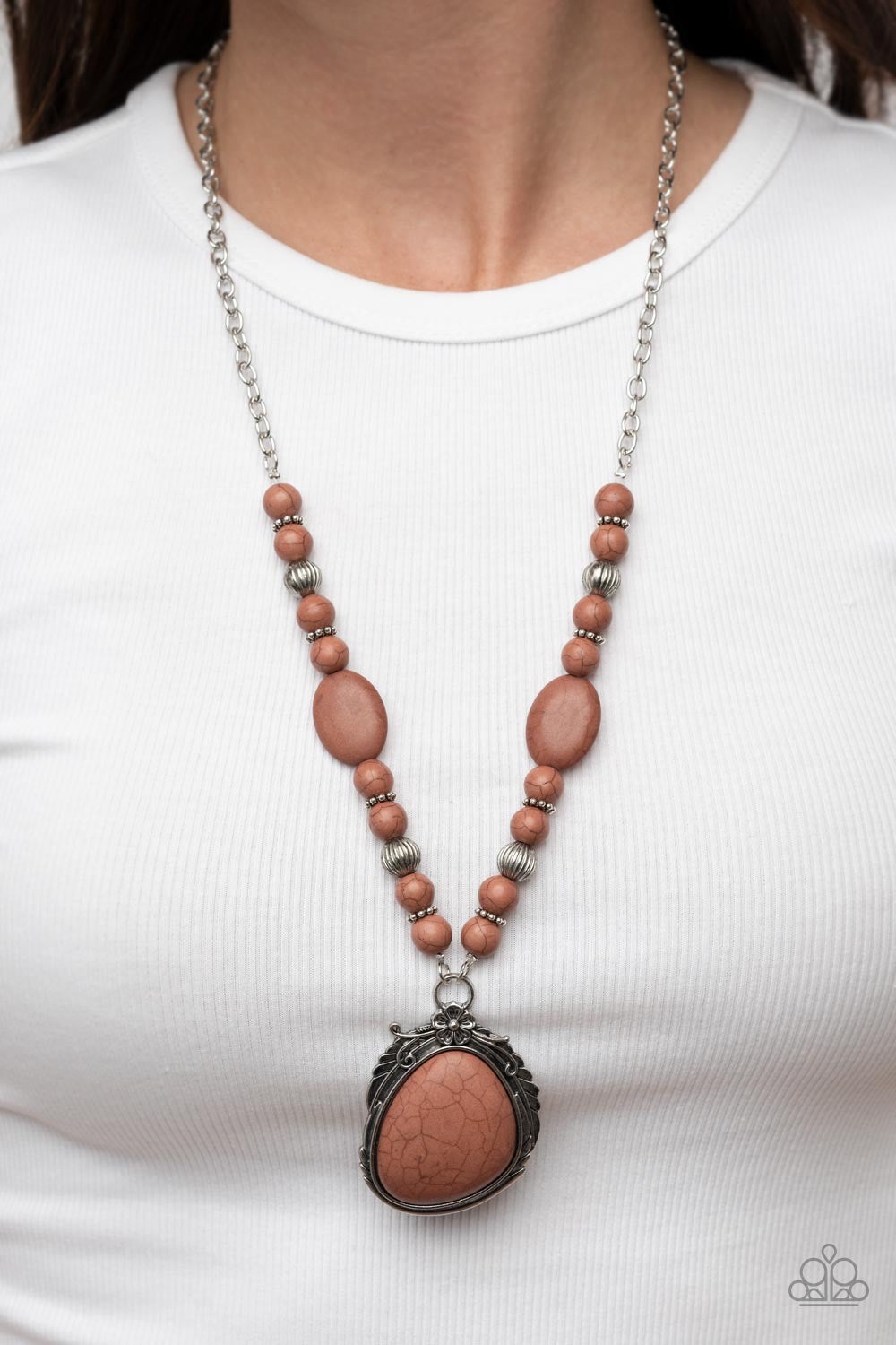 A lengthened silver chain flows into a succession of polished brown stone beads and silver accents. The flowy display gives way to an opulent brown stone that is pressed into an ornate silver frame. Adorned with fanciful antiqued silver flower, vine, and feather-like motifs, the elegantly rustic pendant makes a striking impact. Features an adjustable clasp closure.