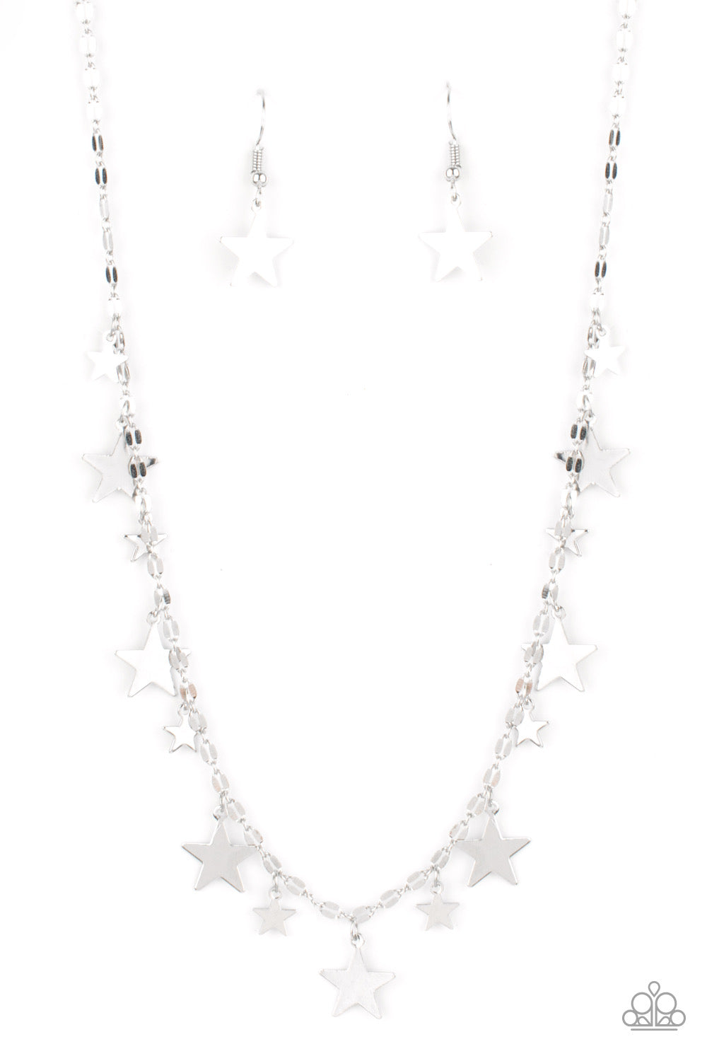Varying in size, dainty shiny silver stars alternate along a decorative silver chain, creating a stellar fringe below the collar. Features an adjustable clasp closure.