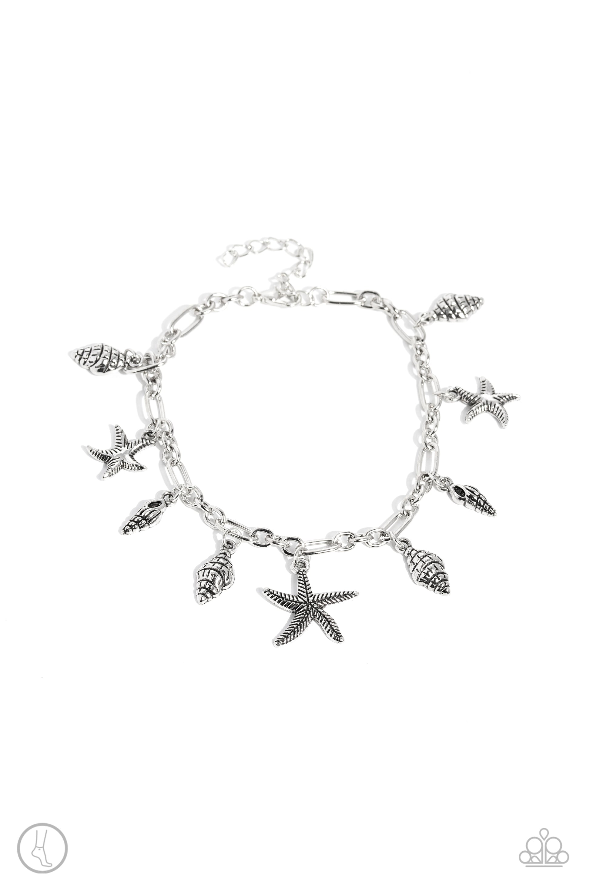 A fringe of silver starfish and seashell charms in varying sizes swings from a silver paperclip chain, creating a beachy monochromatic masterpiece around the ankle. Features an adjustable clasp closure.