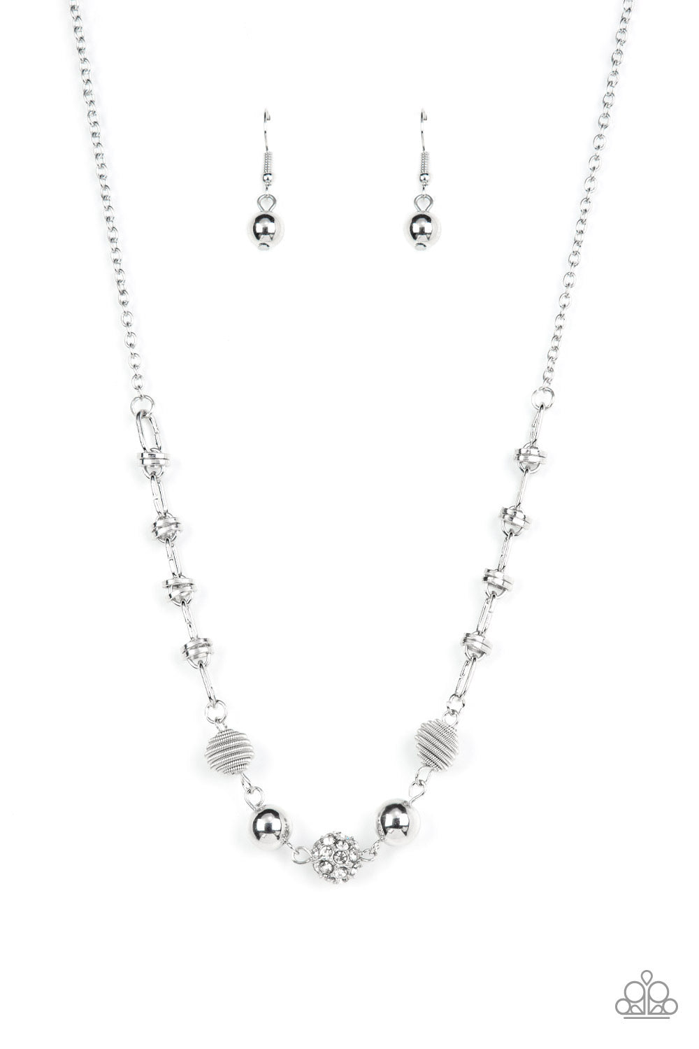 Pairs of silver coiled and smooth silver beads flank a white rhinestone encrusted bead along an oval and silver disc linked chain, creating a glitzy combination below the collar. Features an adjustable clasp closure.