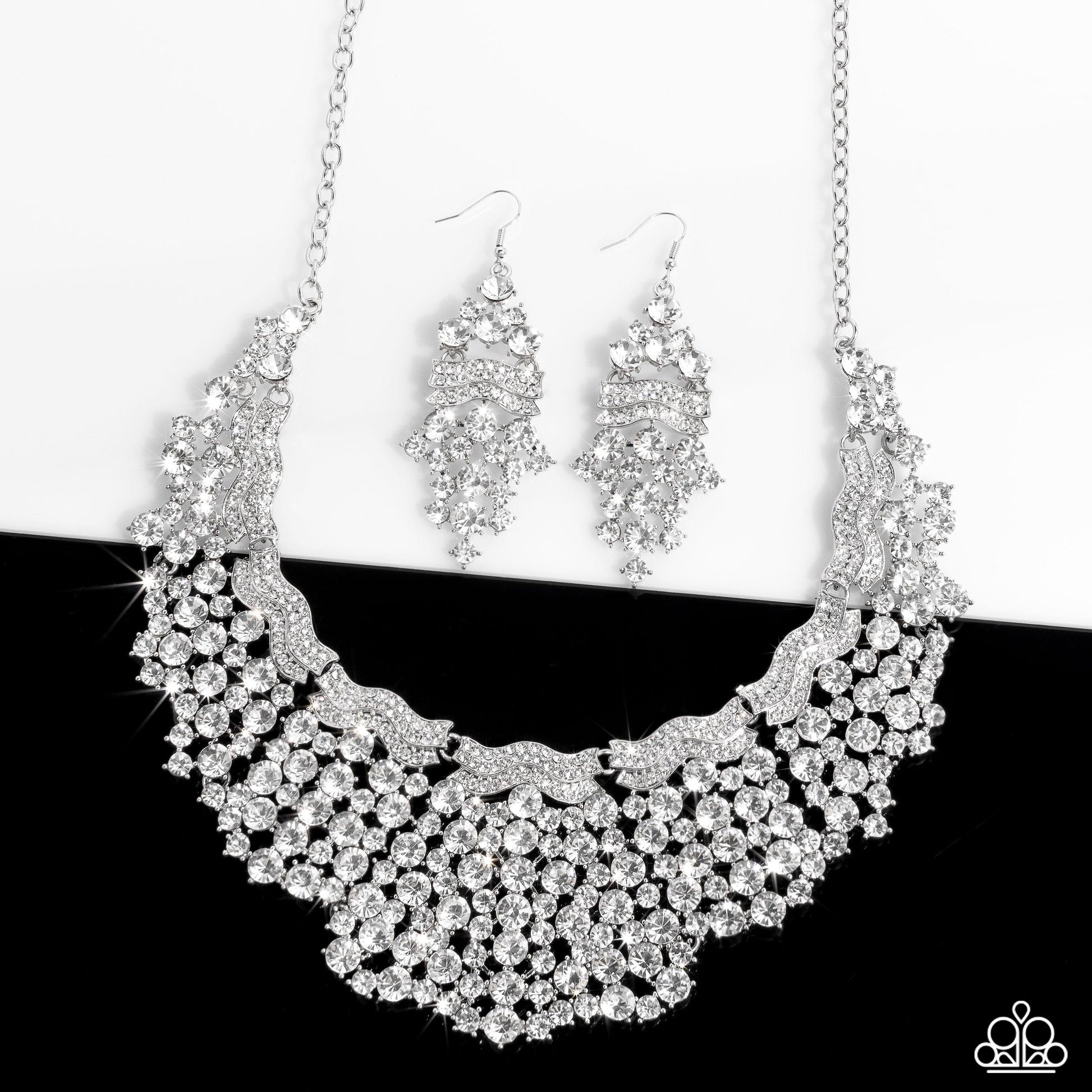 Wavy silver bars, encrusted in white rhinestones, create a striking silhouette as they fall along the neckline. An explosion of sparkle erupts below the brilliant bands, with countless white rhinestones strategically staggered to create the illusion of floating solitaires. Pronged settings add a hint of vintage refinement, with the centermost section of the design emphasized by an extra row of dazzling detail. Features an adjustable clasp closure.