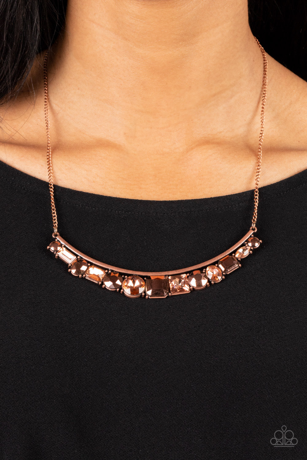 Featuring round, emerald, oval, and square cuts, a glitzy collection of copper aurum and coppery rhinestones alternates along the bottom of a curved copper rod. The sparkly compilation attaches to a dainty copper chain, creating a smoldering centerpiece below the collar. Features an adjustable clasp closure.