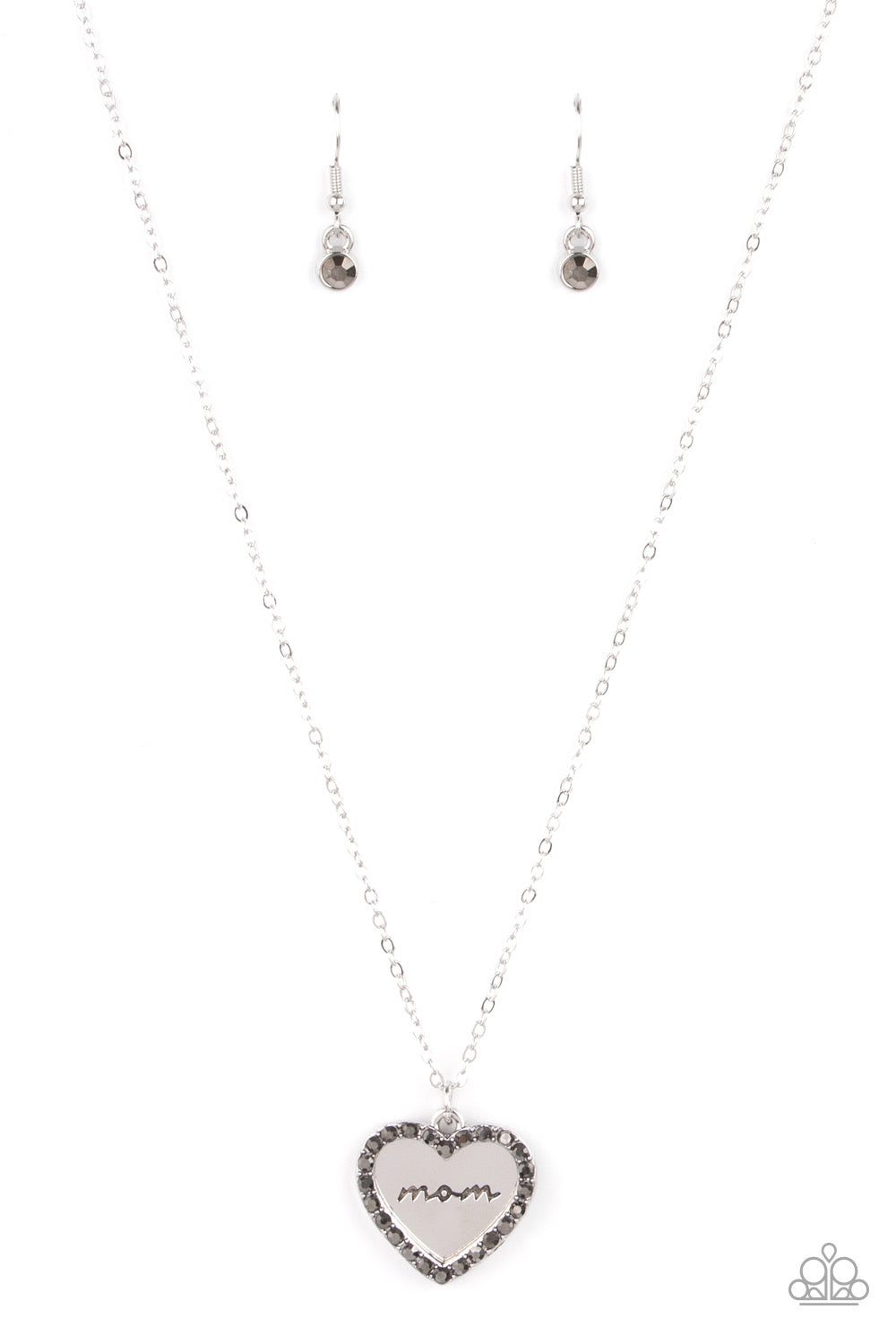 Infused with a smoky hematite rhinestone encrusted silver heart, a silver heart shaped pendant is stamped in the word, "Mom," as it swings below the collar, creating a sparkly sentimental statement piece. Features an adjustable clasp closure.