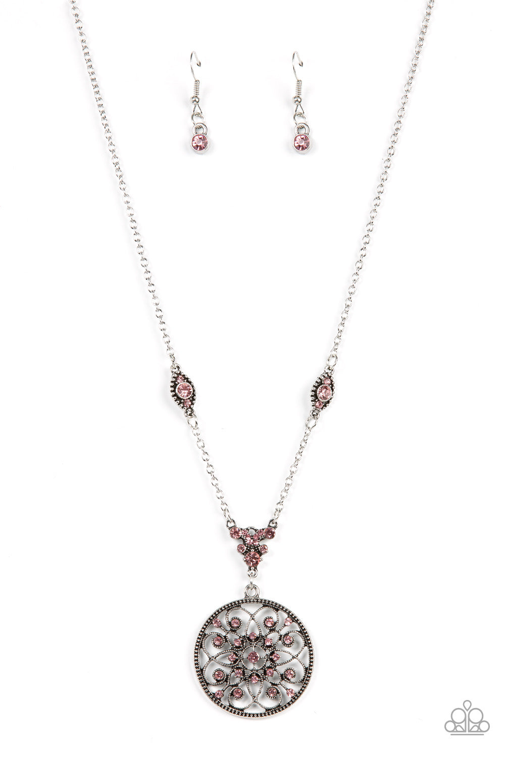 Glittery pink rhinestones are sprinkled across a silver floral frame, creating a timeless pendant at the bottom of a dainty silver chain that has been enhanced with matching pink rhinestone embellished frames. Features an adjustable clasp closure.