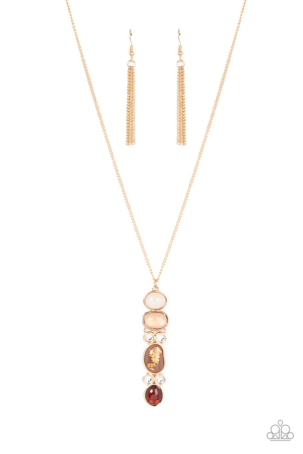 A glassy display of sparkly, glassy, and gold flecked brown and pink beads and pairs of glitzy white rhinestones delicately stacks into an ethereal pendant at the bottom of a gold chain. Features an adjustable clasp closure.