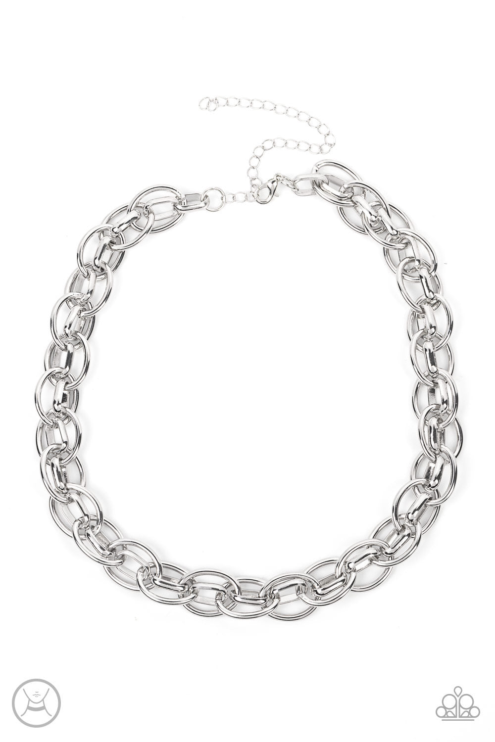 An oversized silver chain interlocks with an oval linked chain, resulting in a rebellious fashion around the neck. Features an adjustable clasp closure.