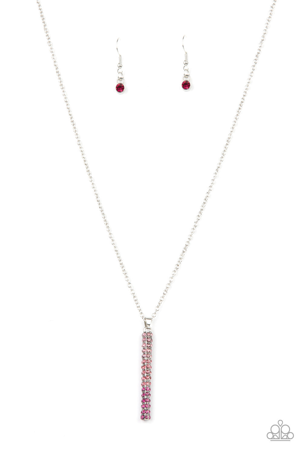 A sparkly collection of spectrum pink rhinestones are encrusted along a silver pendulum that swings along the bottom of a silver chain, creating a glittery ombre effect. Features an adjustable clasp closure.