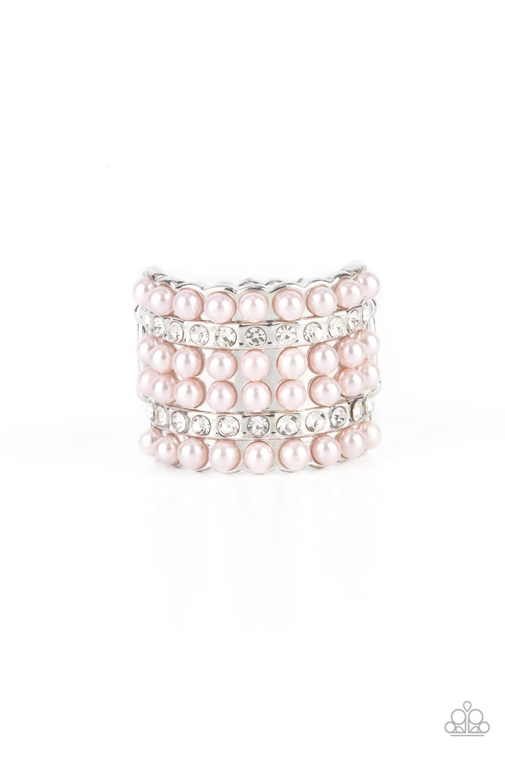 Dainty rows of bubbly pink pearls and glassy white rhinestones alternate across the front of a thick silver band, creating a vintage inspired statement piece. Features a stretchy band for a flexible fit.