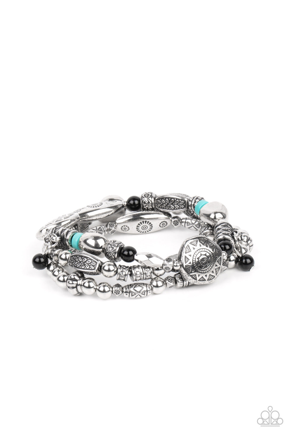 Infused with hints of black and turquoise accents, a mismatched collection of silver beads, textured silver accents, and floral and sunburst embossed beads are threaded along stretchy bands around the wrist for a whimsically layered look.