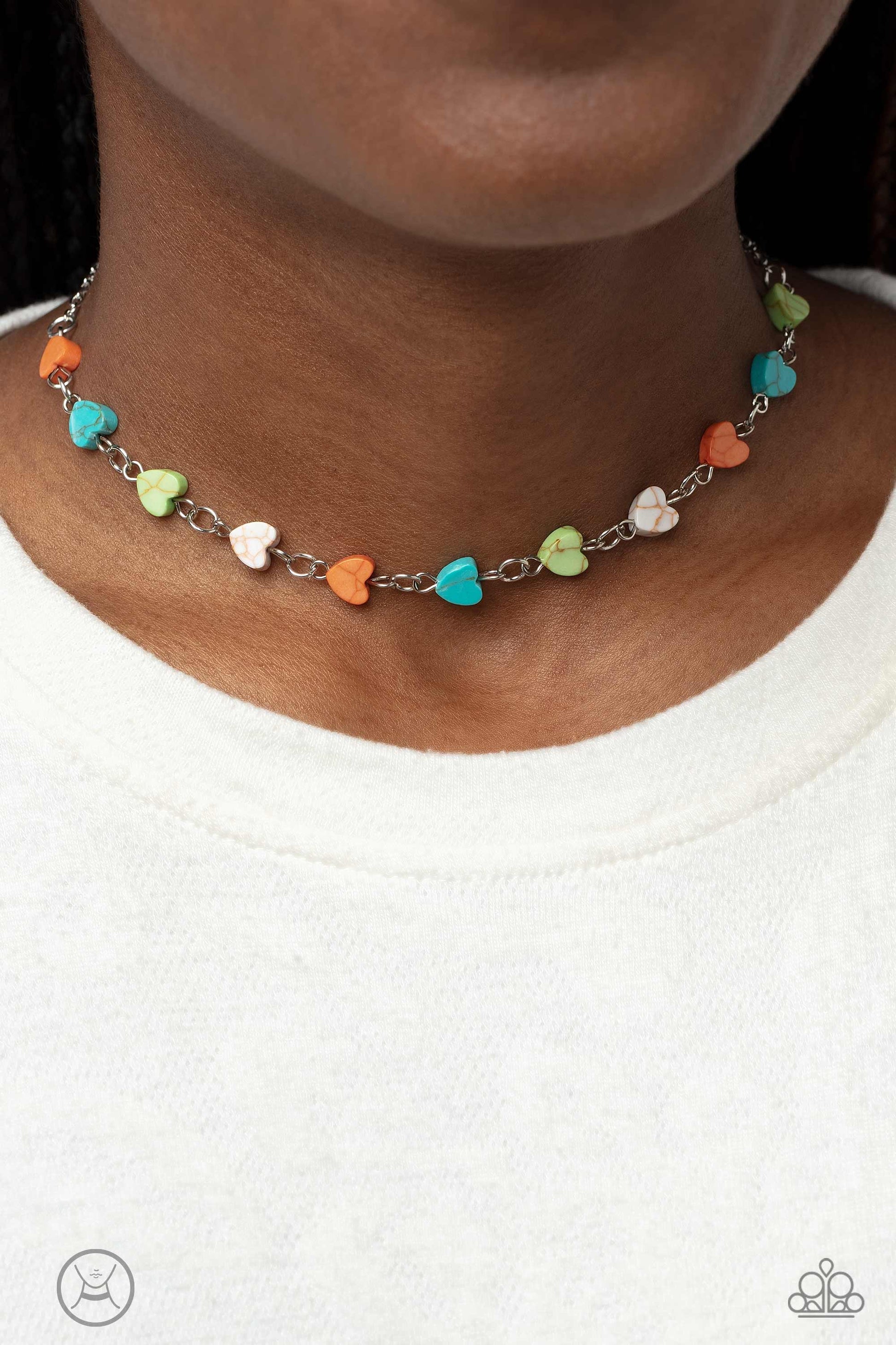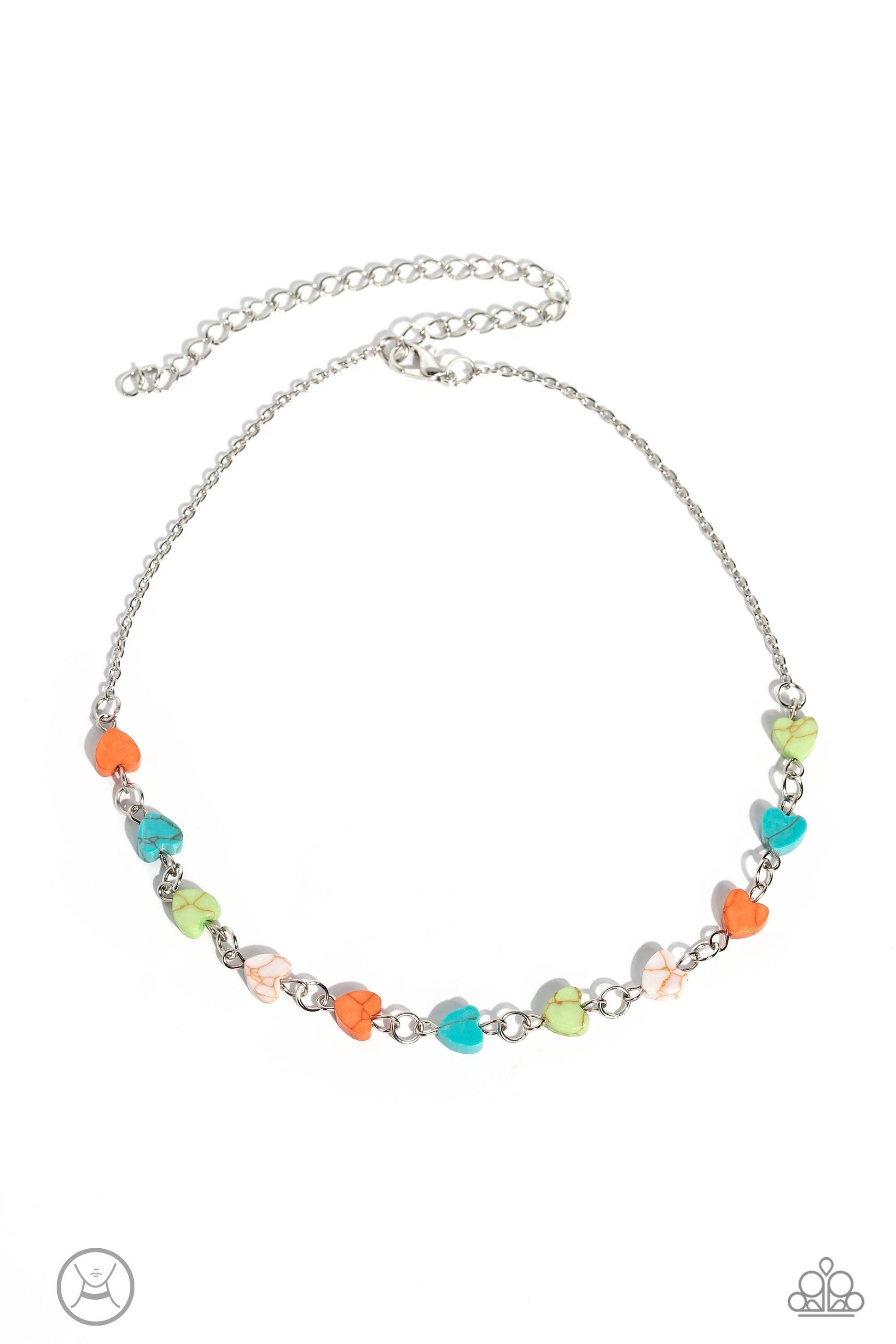 Heart-shaped stones in shades of green, turquoise, orange and white dances along a dainty, shimmery silver chain below the collar for a romantic finish. Features an adjustable clasp closure. As the stone elements in this piece are natural, some color variation is normal.