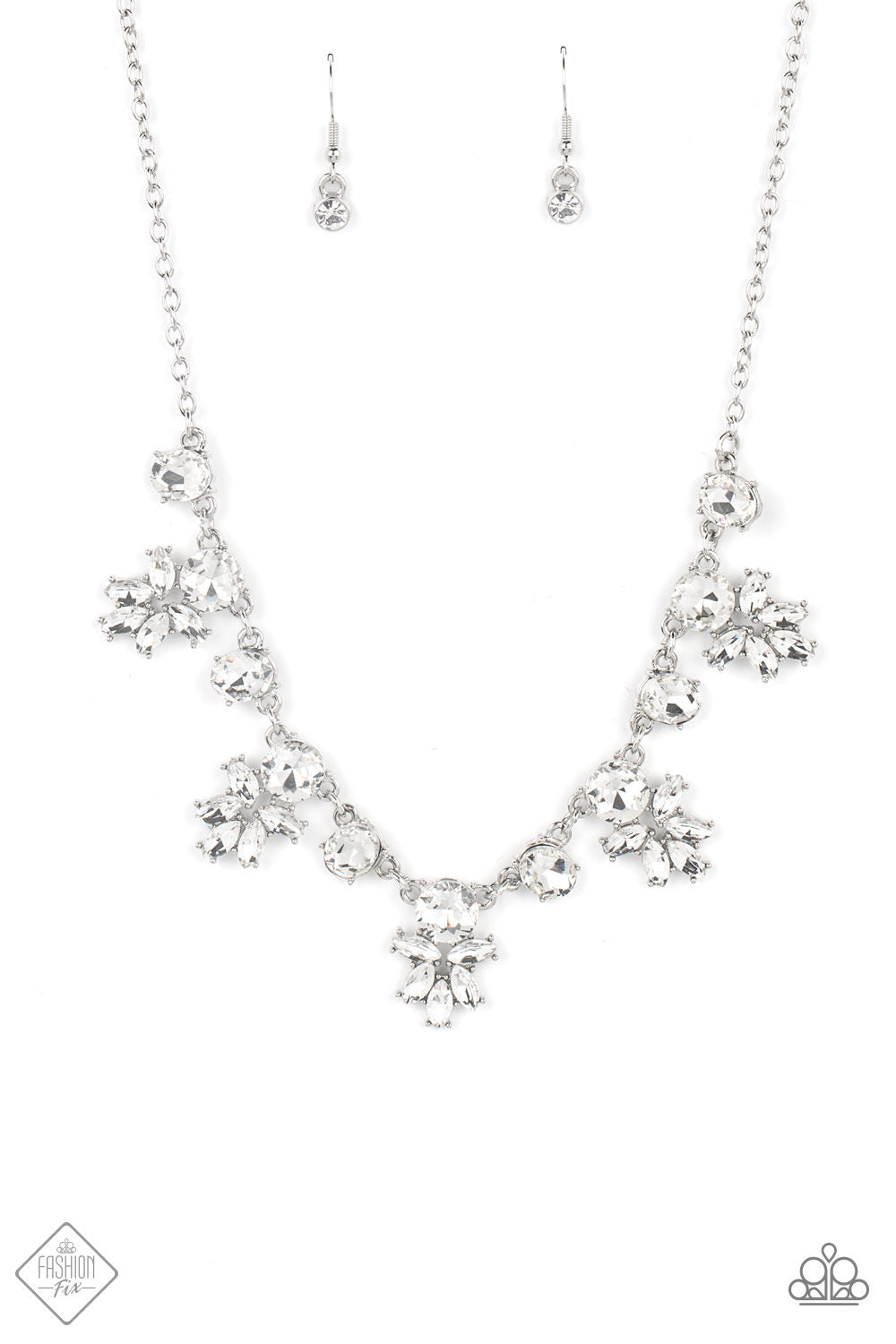 Brilliant round rhinestones accented with clusters of marquise cut gems decorate a dainty silver chain. Oval solitaire rhinestones add extra sparkle between the cascading clusters, resulting in a stunning display below the collar. Features an adjustable clasp closure.
