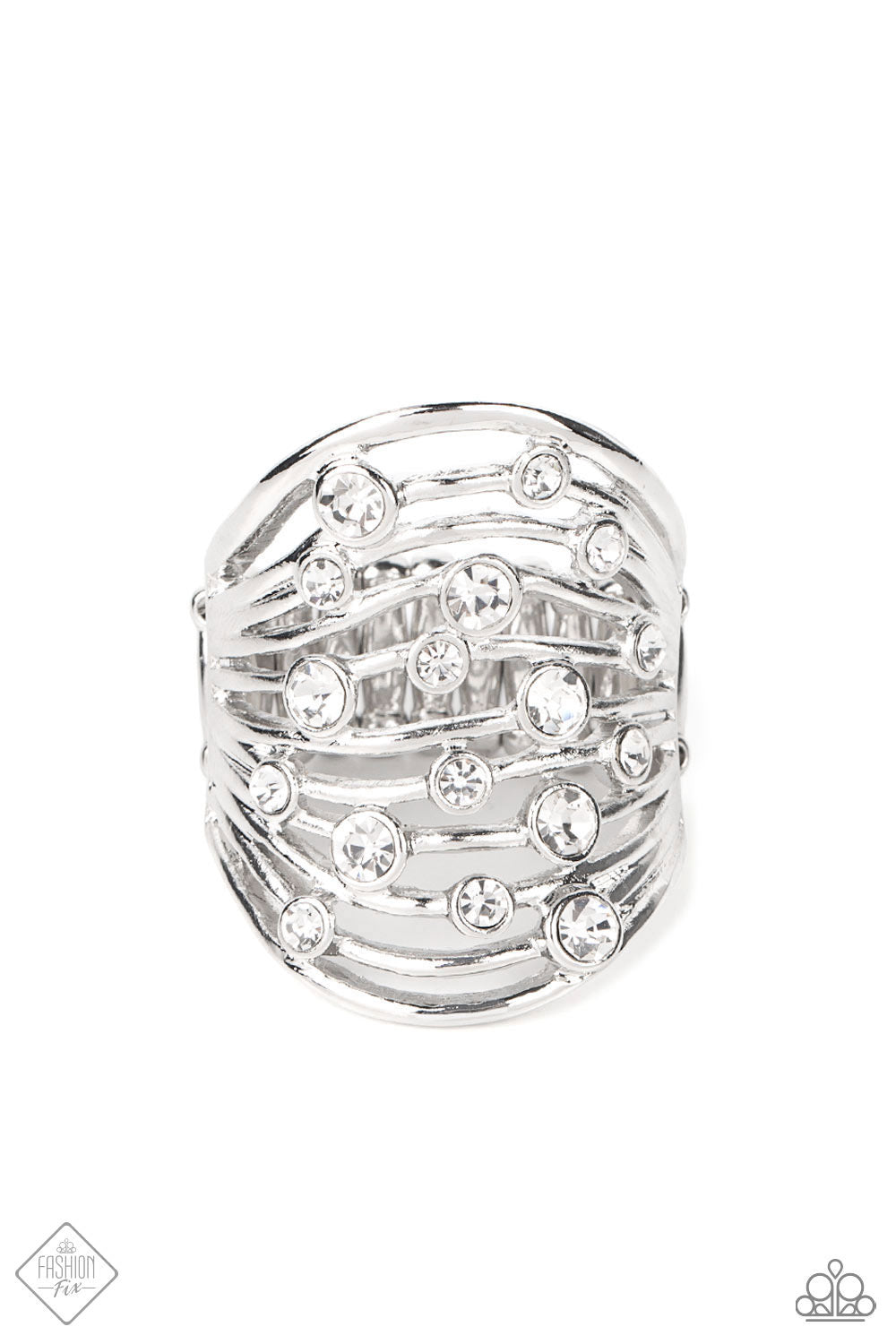 A constellation of brilliant white rhinestones is sprinkled across wavy silver bands as they layer and stack, creating an ethereal centerpiece atop the finger. Features a stretchy band for a flexible fit.