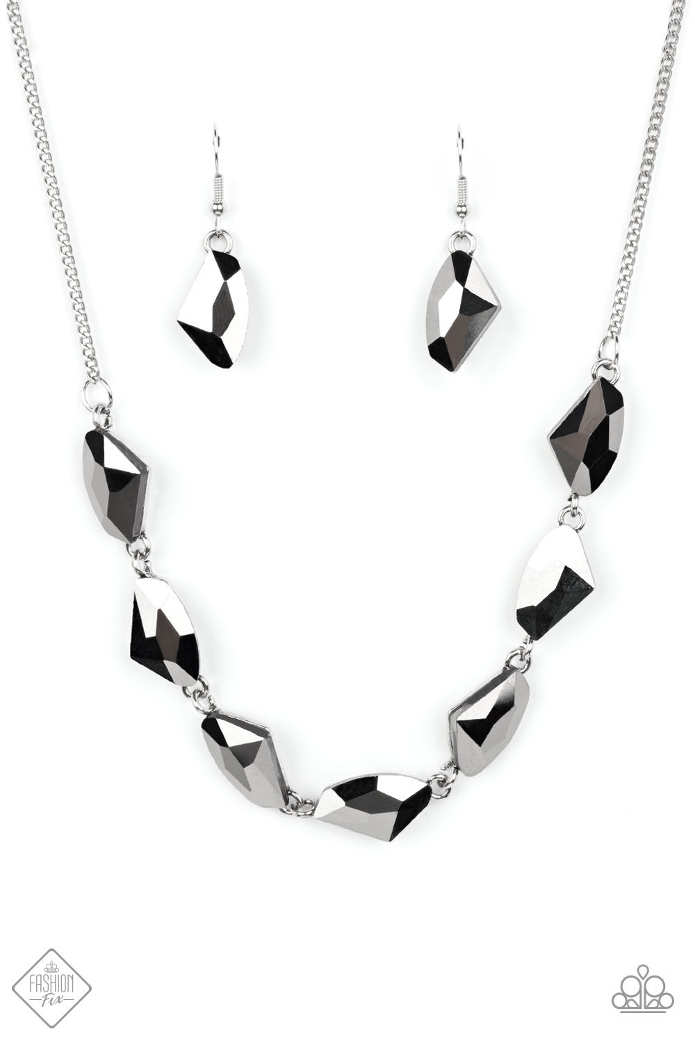 A jagged collection of hematite rhinestones falls along the neckline in a fierce display. The asymmetrical cuts of each rhinestone are emphasized by their dramatic faceted surfaces, bouncing light in every direction and emitting a sleek metallic sheen. Features an adjustable clasp closure.