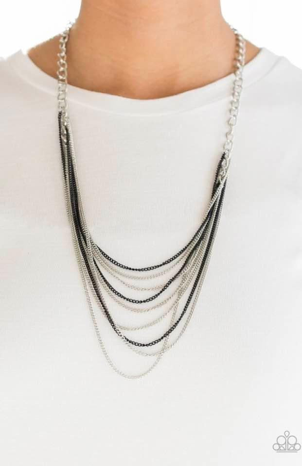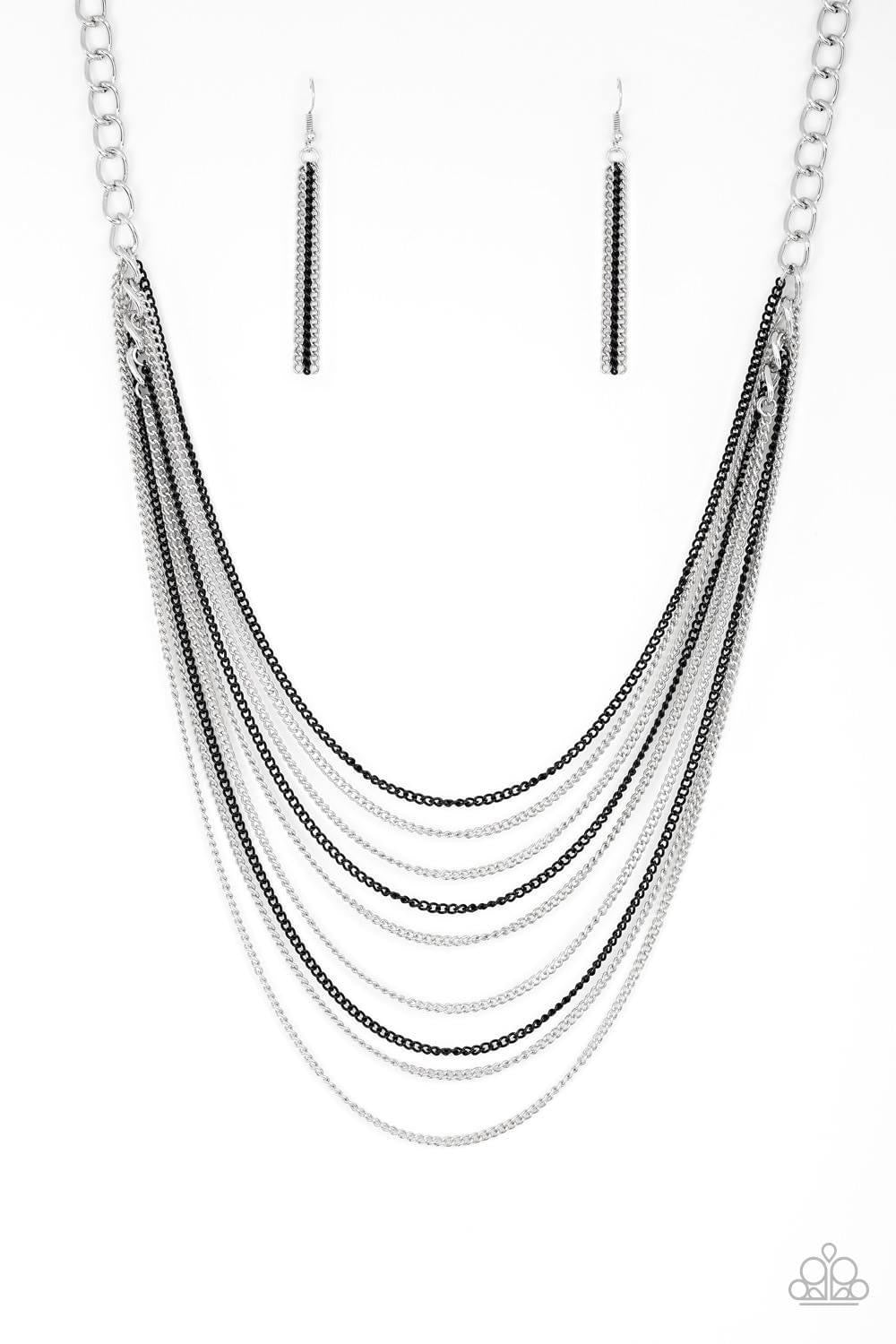 Strands of bold silver links give way to rows of shimmery silver and shiny black chains, creating colorful layers down the chest. Features an adjustable clasp closure. Sold as one individual necklace. Includes one pair of matching earrings.