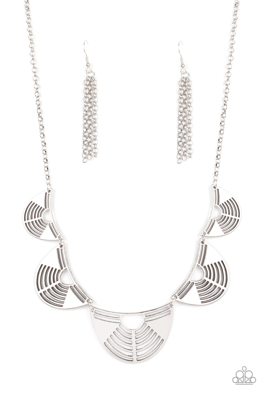 Featuring airy geometric cutouts, antiqued silver crescent shaped frames increase in size as they delicately link below the collar, creating an edgy fringe. Features an adjustable clasp closure.