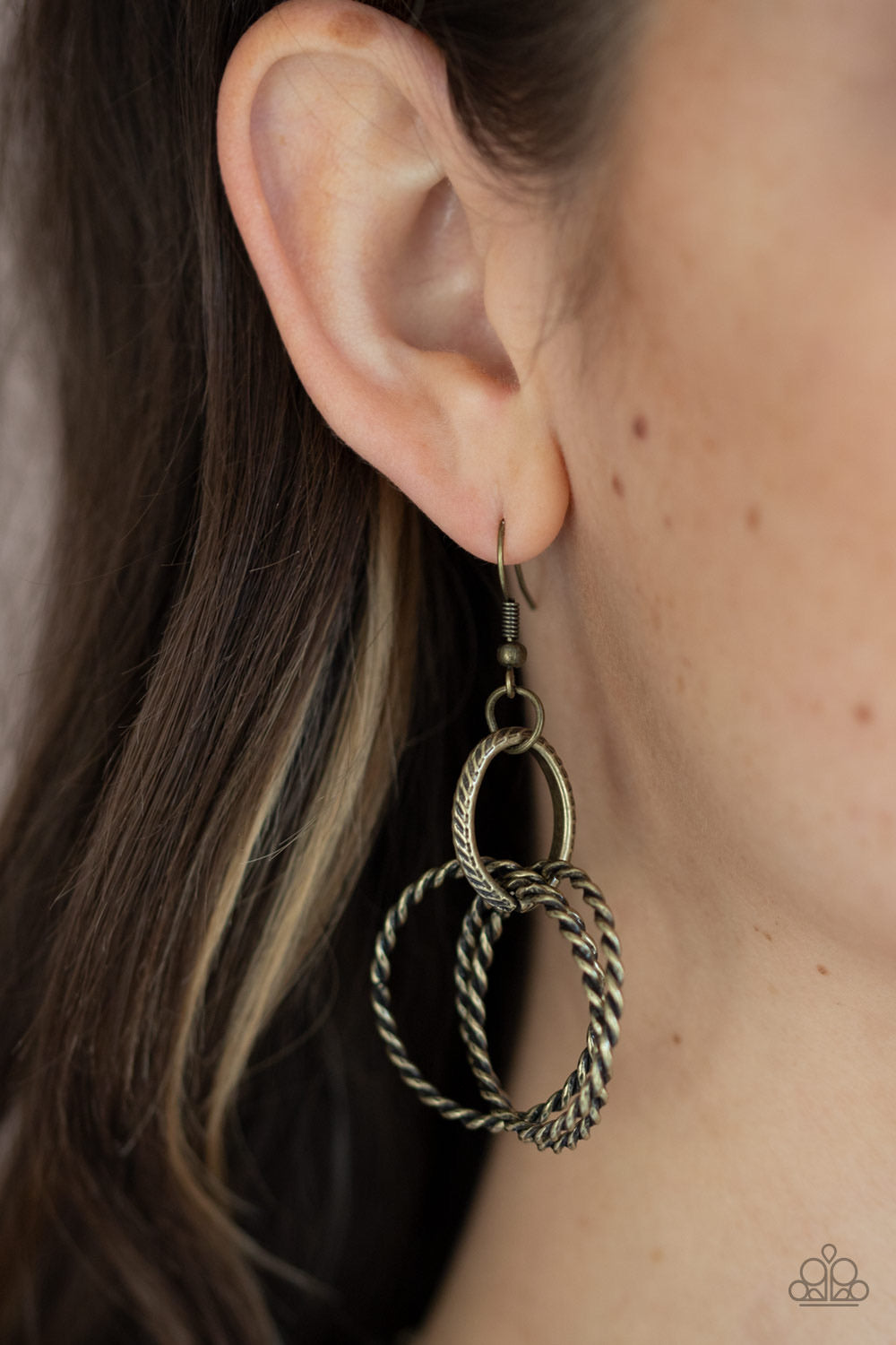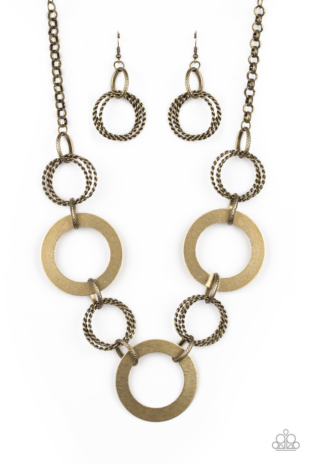 Flat brass circles link with trios of twisted brass rings below the collar for a dramatic industrial display. Features an adjustable clasp closure.