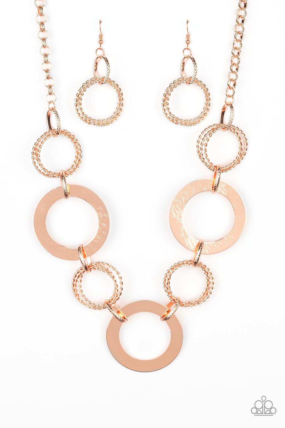 Flat shiny copper circles link with trios of twisted shiny copper rings below the collar for a dramatic industrially display. Features an adjustable clasp closure.