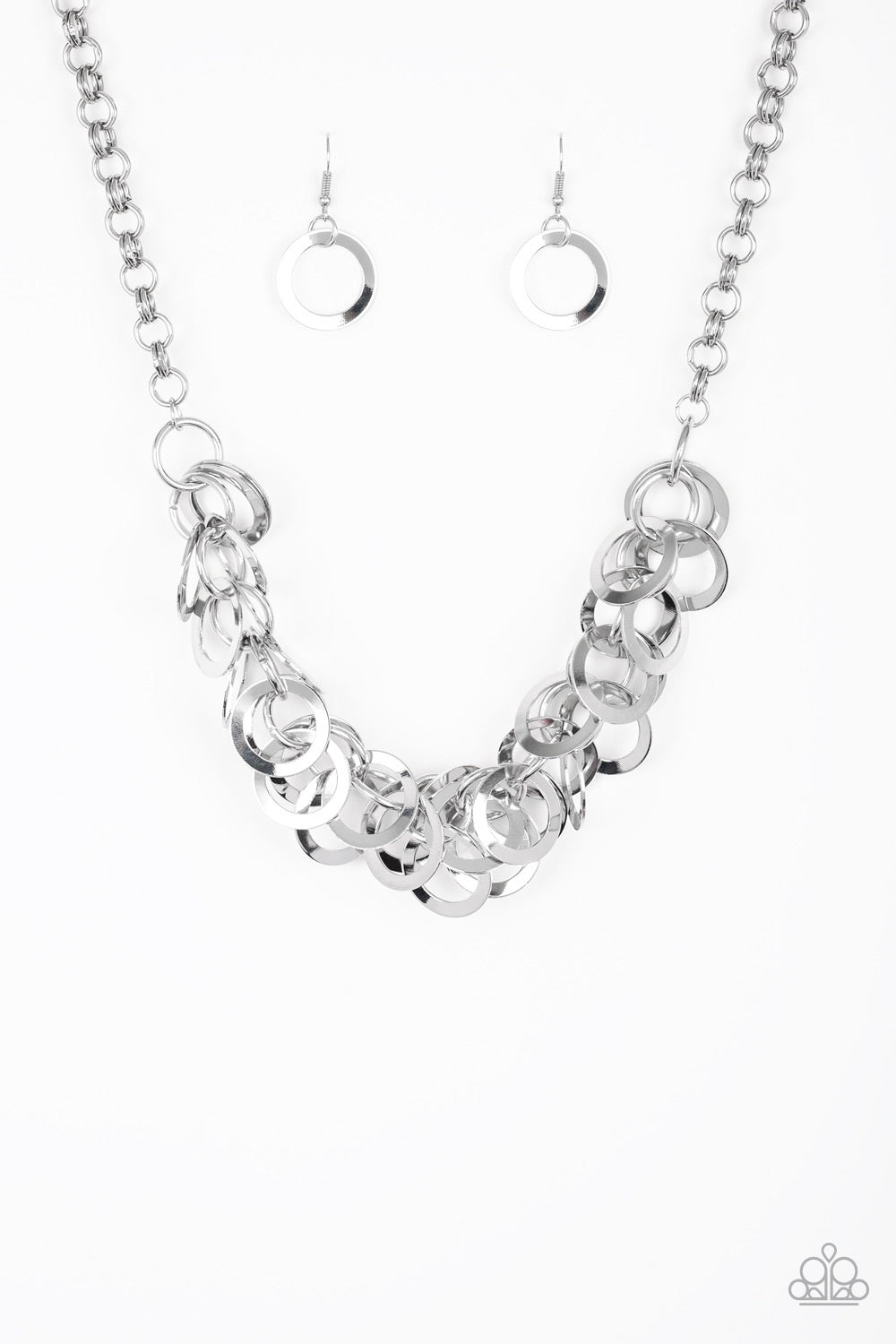 Countless silver rings dangle from a shimmery silver chain, creating a clustered fringe below the collar. Features an adjustable clasp closure.