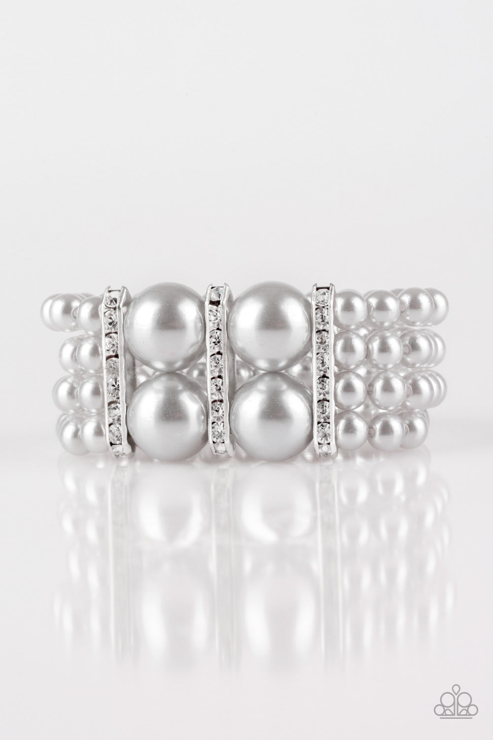 Strands of classic silver pearls are threaded along stretchy elastic bands and joined together by white rhinestone encrusted frames. The glittery frames combine with oversized pearls at the center, adding a dramatic twist to the classic pearl palette.