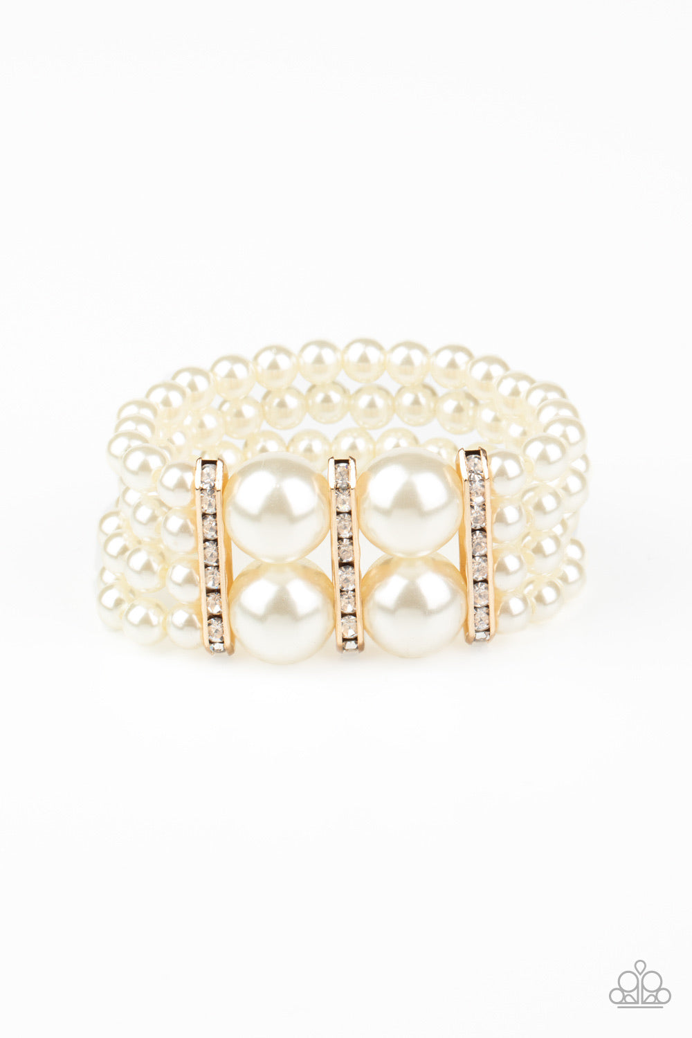 Strands of timeless white pearls are threaded along stretchy elastic bands and joined together by white rhinestone encrusted frames. The glittery frames combine with oversized pearls at the center, adding a dramatic twist to the classic pearl palette.