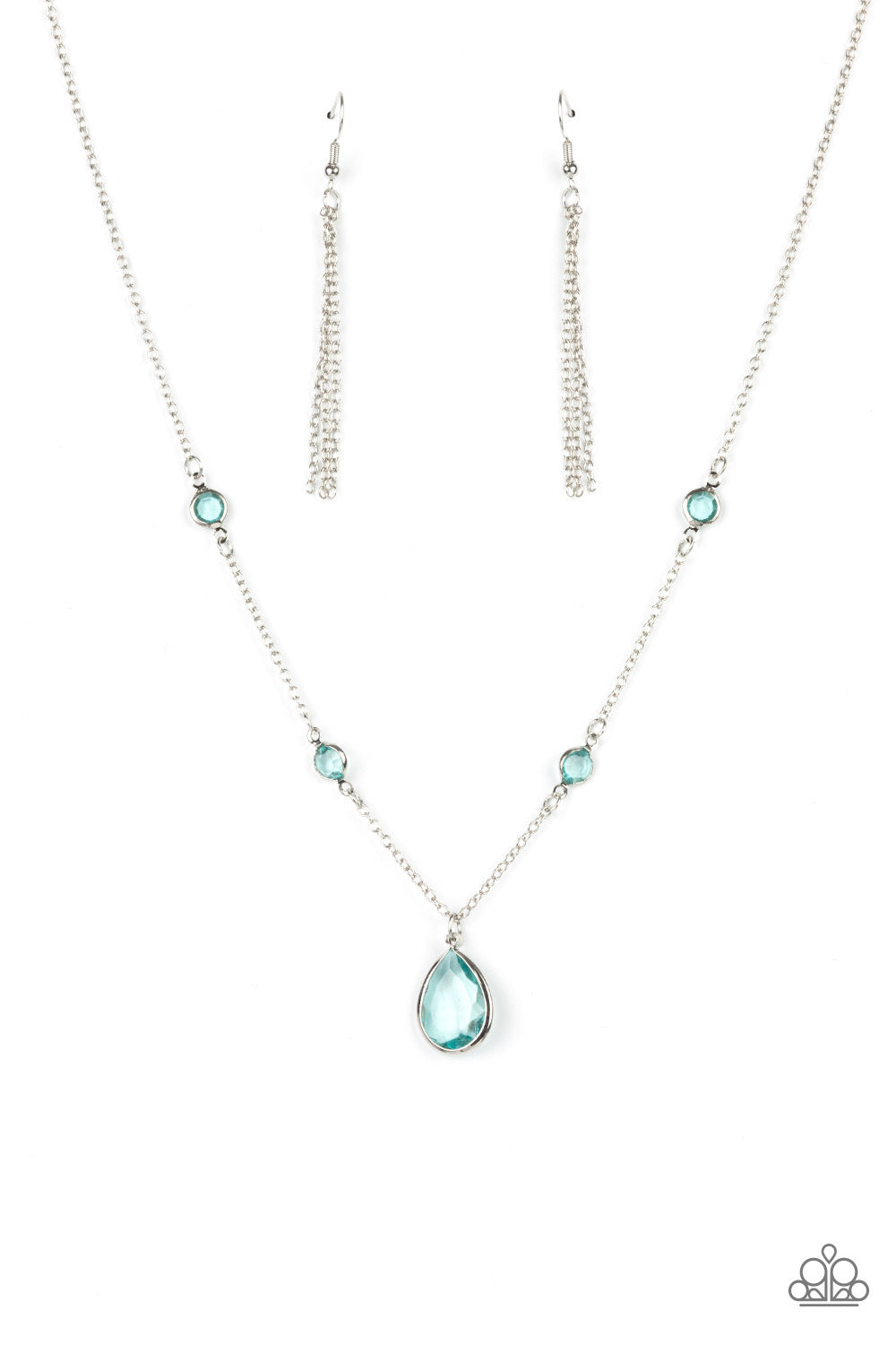 A glassy Blue Radiance teardrop gem encased in a silver frame dips elegantly below the collar. Dainty glassy Blue Radiance gems accent the silver chain for a delicate and dreamy display below the collar. Features an adjustable clasp closure.