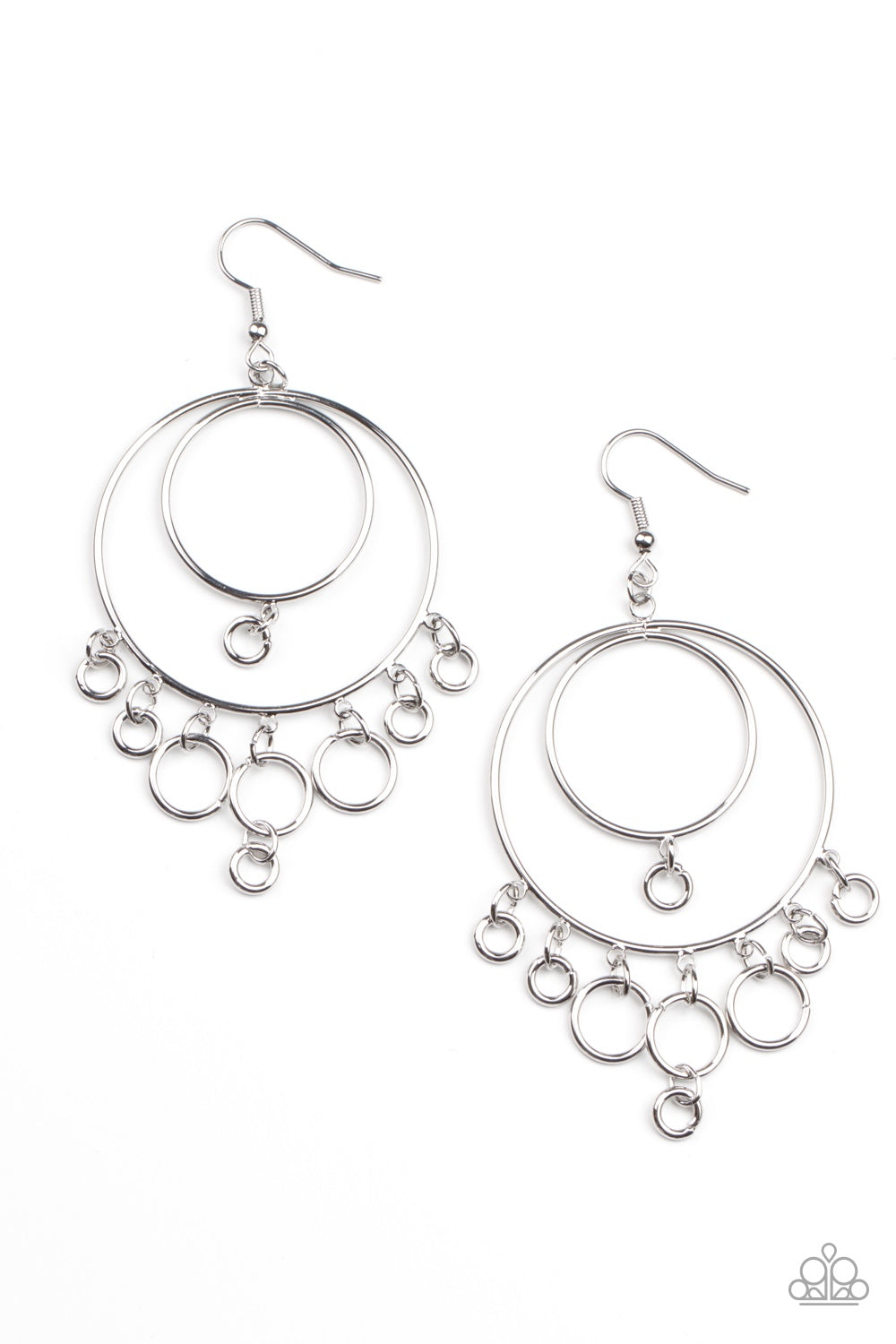 A dainty collection of silver rings swing from the bottom of interconnected silver hoops, creating a dizzying fringe. Earring attaches to a standard fishhook fitting.