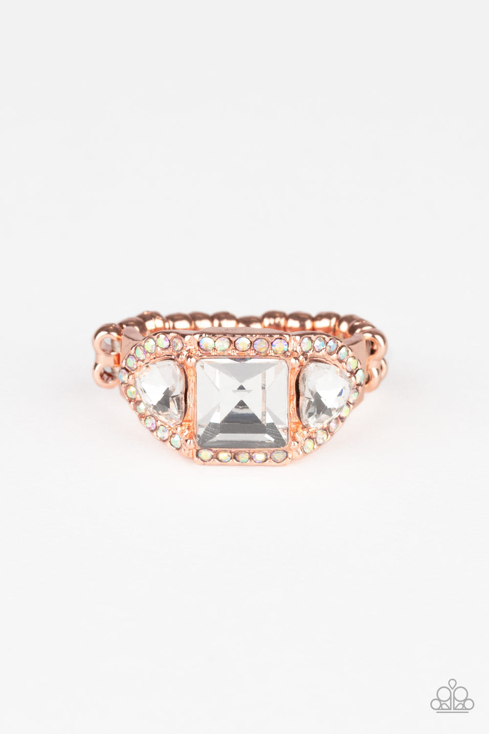 A square cut white rhinestone is flanked by two charming heart shaped white rhinestones atop a shiny copper band dotted in dainty iridescent rhinestones. Features a dainty stretchy band for a flexible fit.