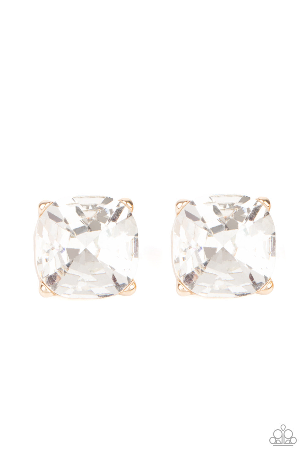 A dramatically oversized white gem is nestled atop a pronged gold frame, creating a jaw-dropping dazzle. Earring attaches to a standard post fitting.