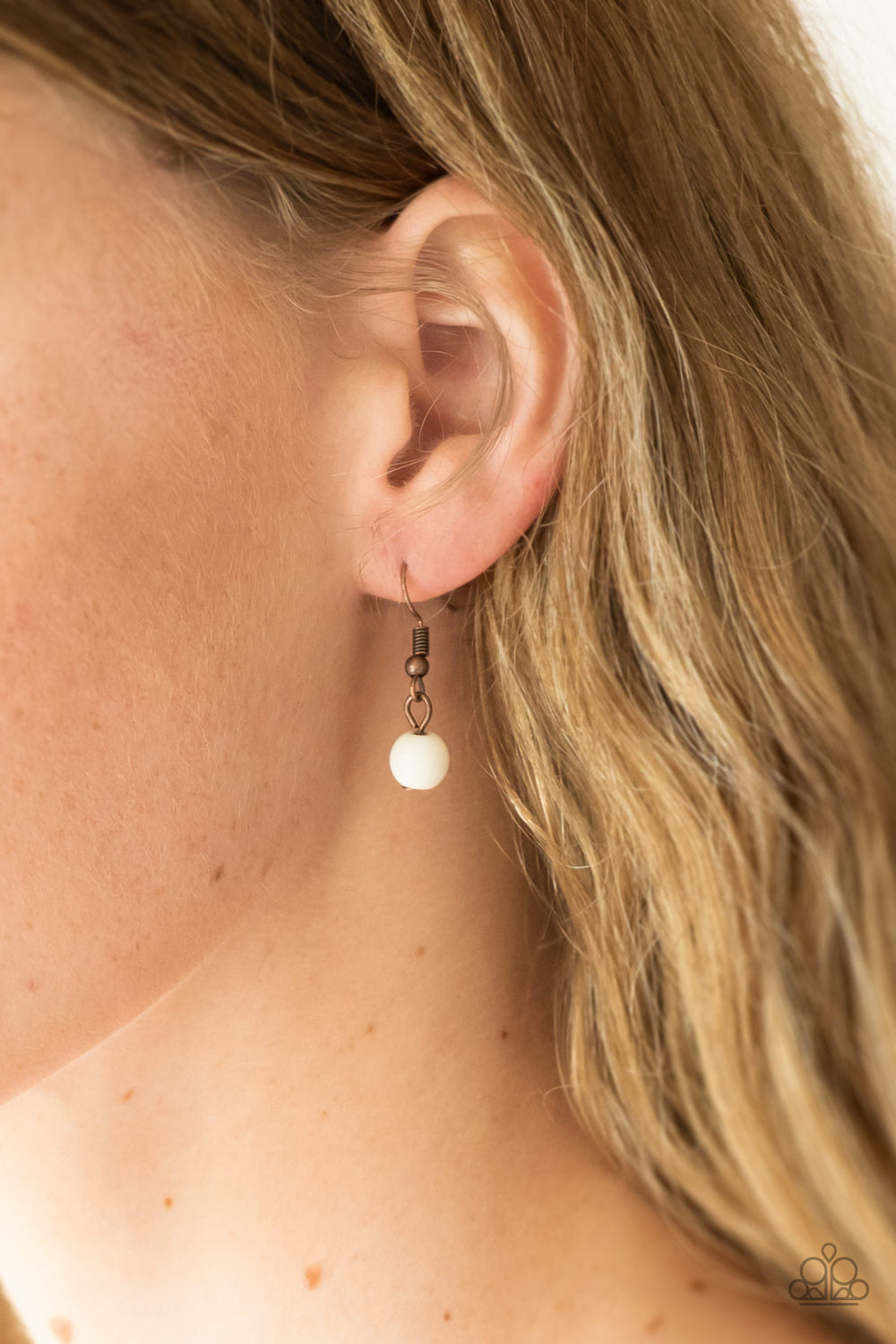 A refreshing white stone is pressed into the center of a shimmery copper frame radiating with sunburst details. The earthy frame swings from the bottom of a lengthened copper chain for a seasonal finish. Features an adjustable clasp closure.