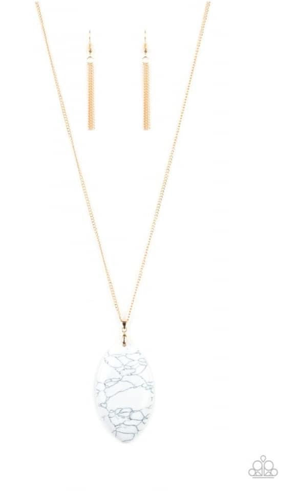 Chiseled into a tranquil almond-shape, an oversized white stone pendant swings from the bottom of a lengthened gold chain in a seasonal fashion. Features an adjustable clasp closure.