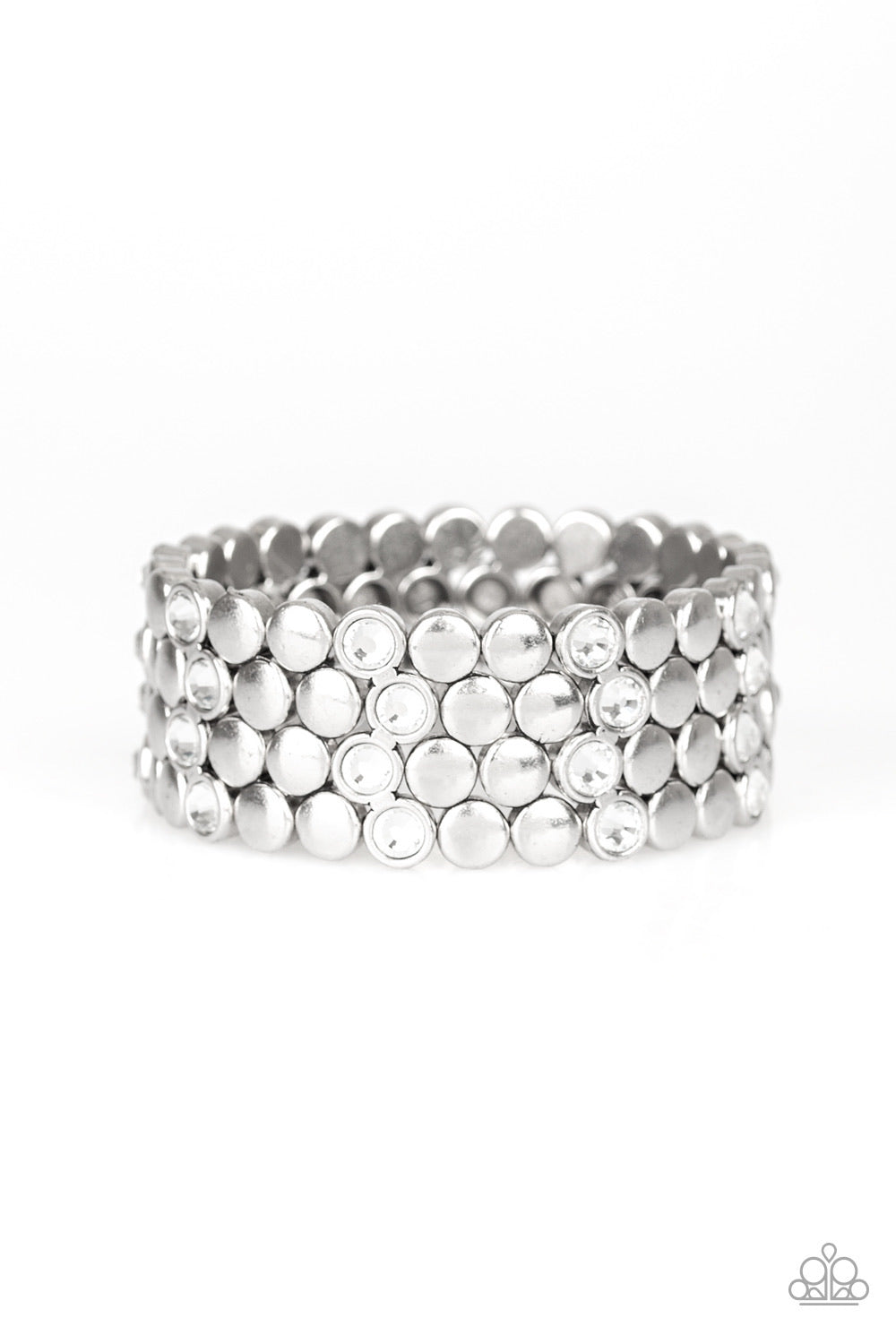 A collection of frames featuring flat silver studs and glittery white rhinestones are threaded along a stretchy band, scattering sparkle across the wrist.