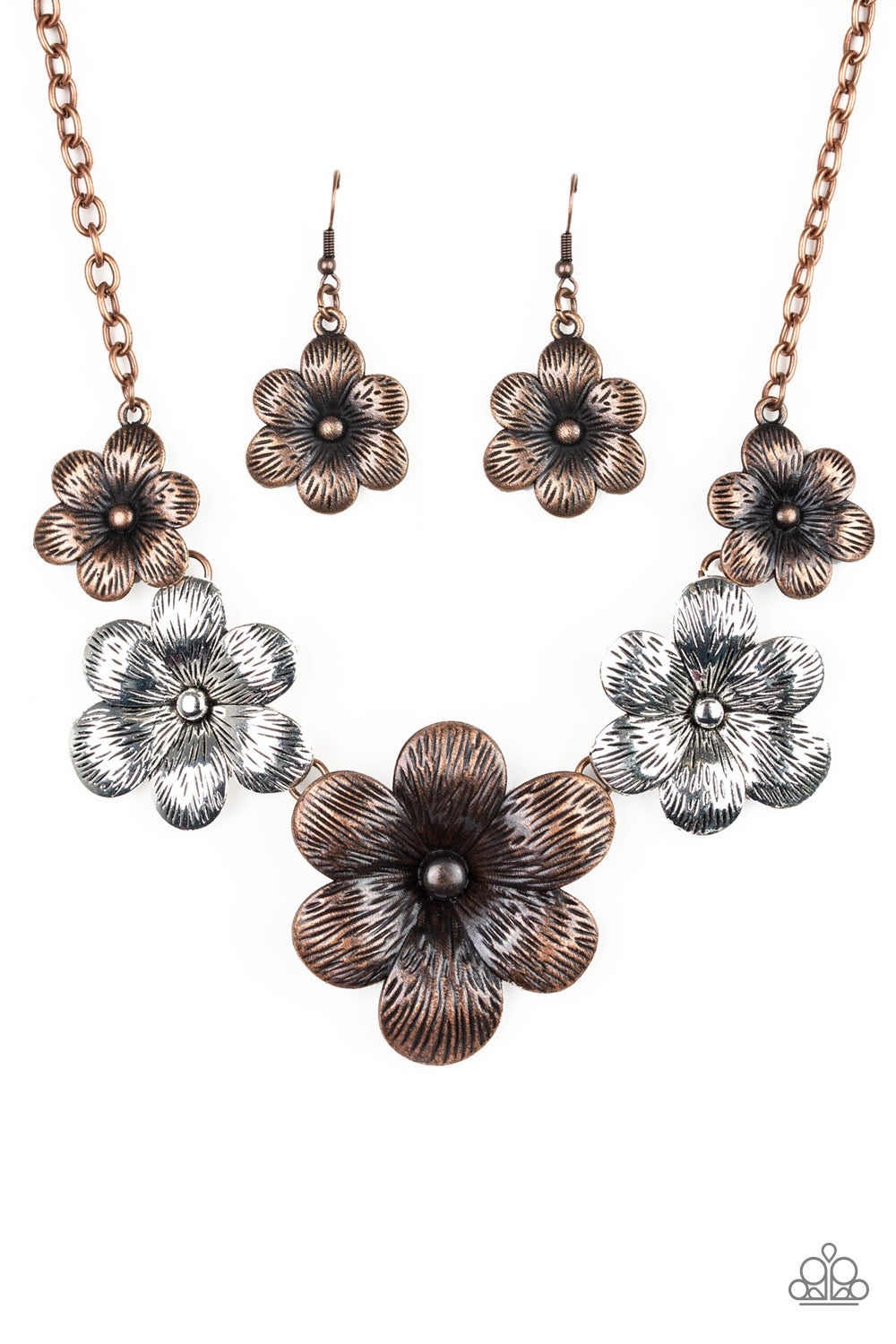 Brushed in an antiqued shimmer, lifelike copper and silver flowers gradually increase in size as they link below the collar in a seasonal fashion. Features an adjustable clasp closure.