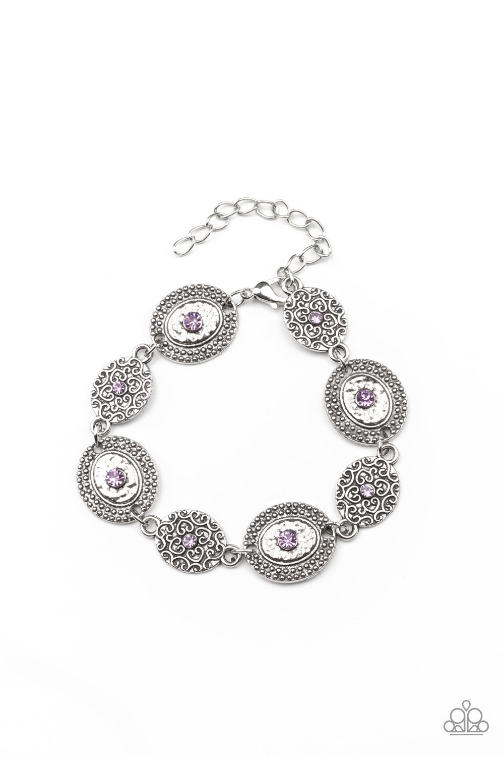 Delicate Amethyst Orchid rhinestones dot the centers of engraved antiqued silver discs. The dotted textures and heart shaped vines create a charming impression as they gracefully link around the wrist. Features an adjustable clasp closure.