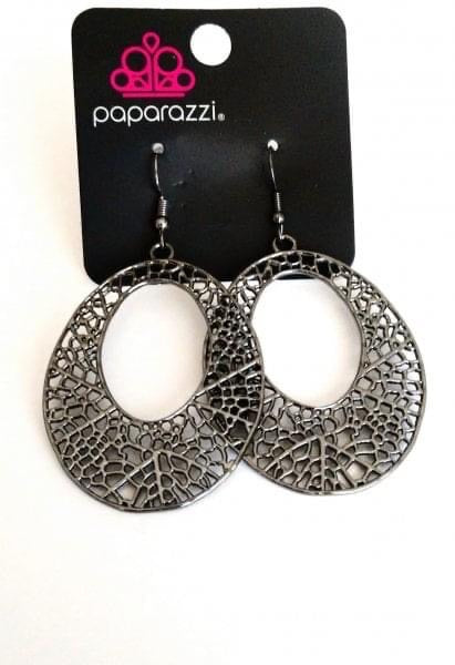 Featuring a shattered metallic pattern, glistening gunmetal filigree coalesces into an airy oval frame for a classic look.