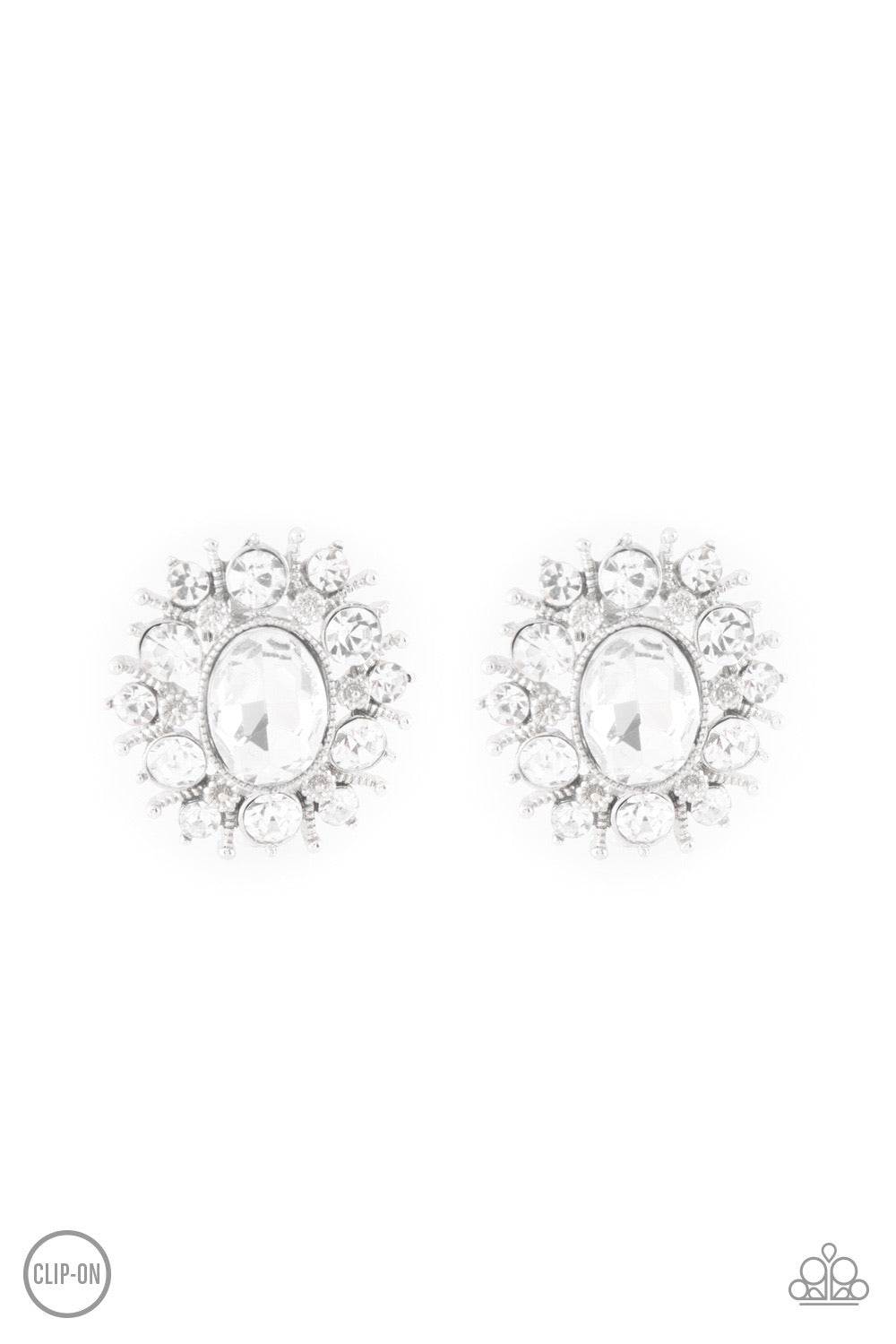 Varying in size, glittery white rhinestones and ornate silver accents burst from a dramatic white gem center for a stellar look. Earring attaches to a standard clip-on fitting.