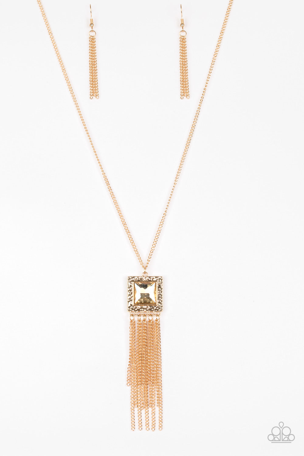 Swinging from the bottom of a lengthened gold chain, a delicately hammered square frame gives way to a shimmery gold fringe. Featuring a regal square cut, a golden gem is pressed into the center of the pendant for an edgy look. Features an adjustable clasp closure.