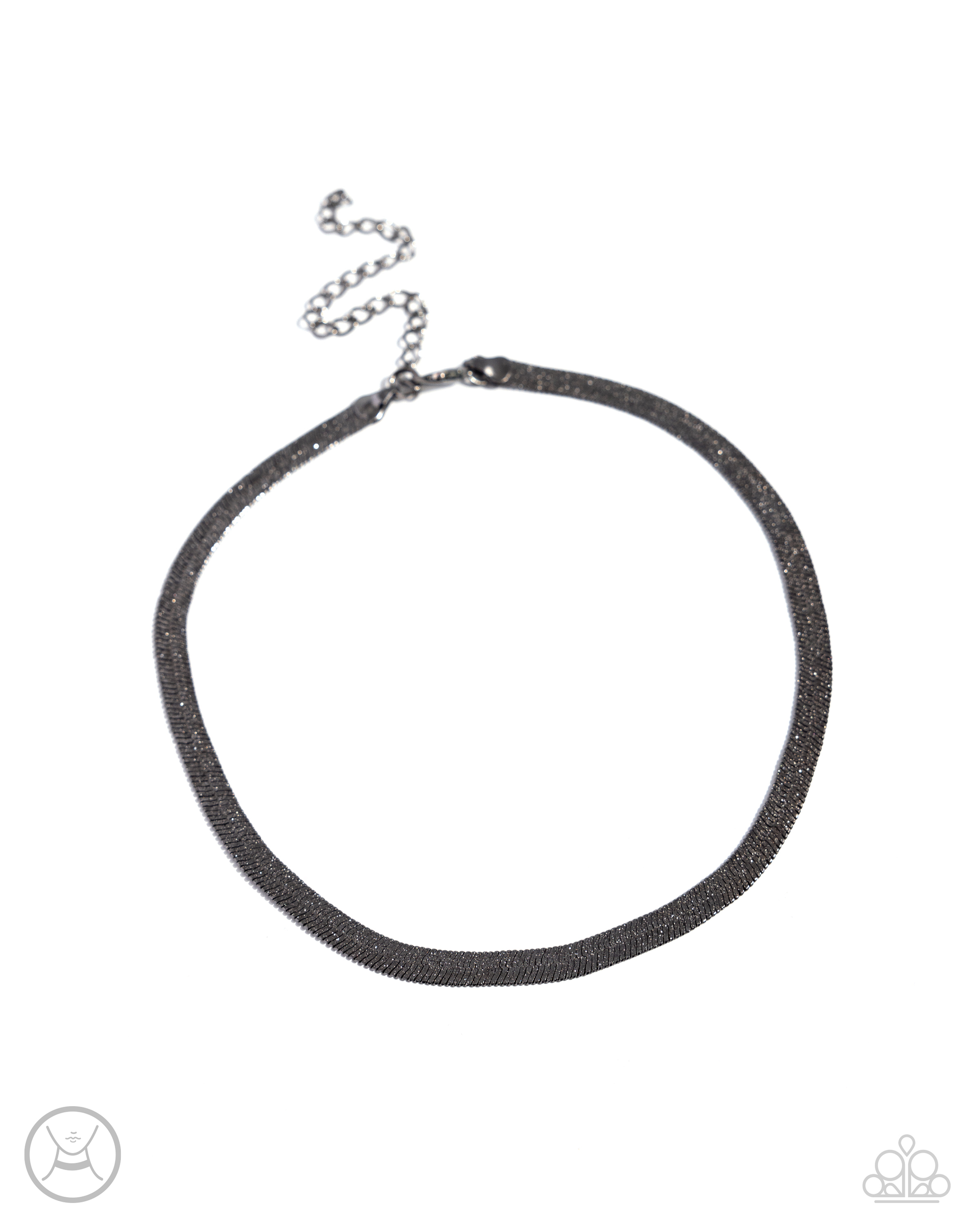 Dusted with dainty white rhinestones, a curved collection of high-sheen gunmetal bars connect around the collar for a simply shimmery statement. Features an adjustable clasp closure.