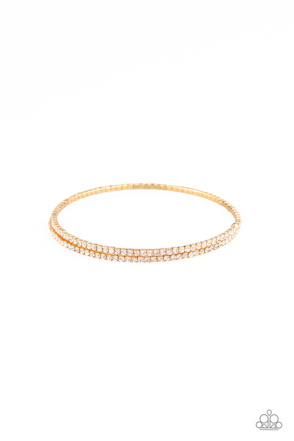 Dotted in dainty white rhinestones, a flexible gold wire coils around the wrist for a refined flair.