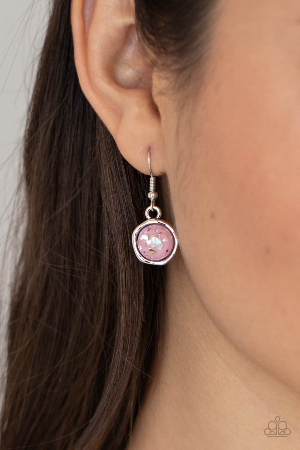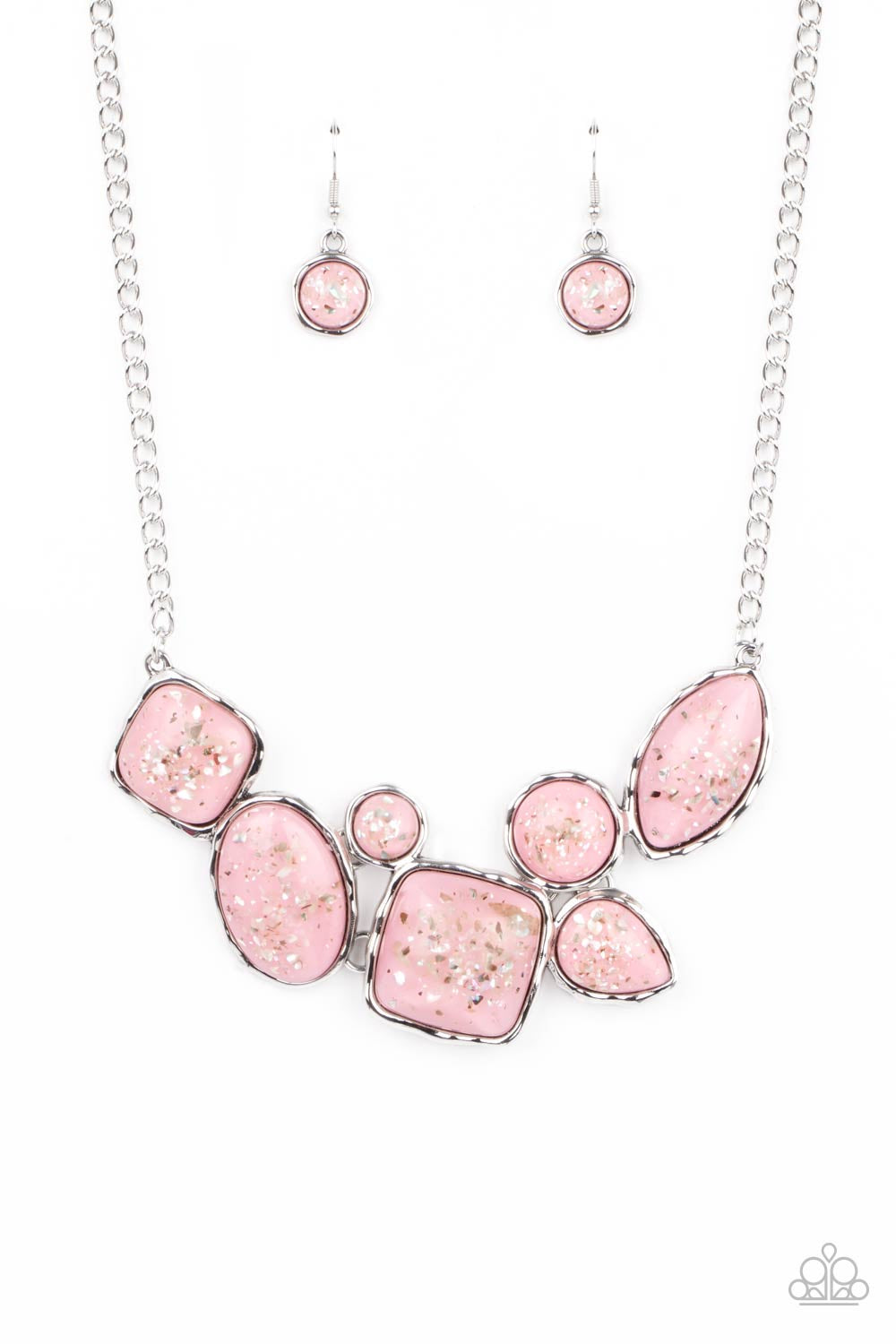 Flecks of iridescent shell-like pieces are encased in glassy pink beads. Featuring hammered silver frames, the mismatched frames delicately cluster below the collar for an ethereal fashion. Features an adjustable clasp closure.