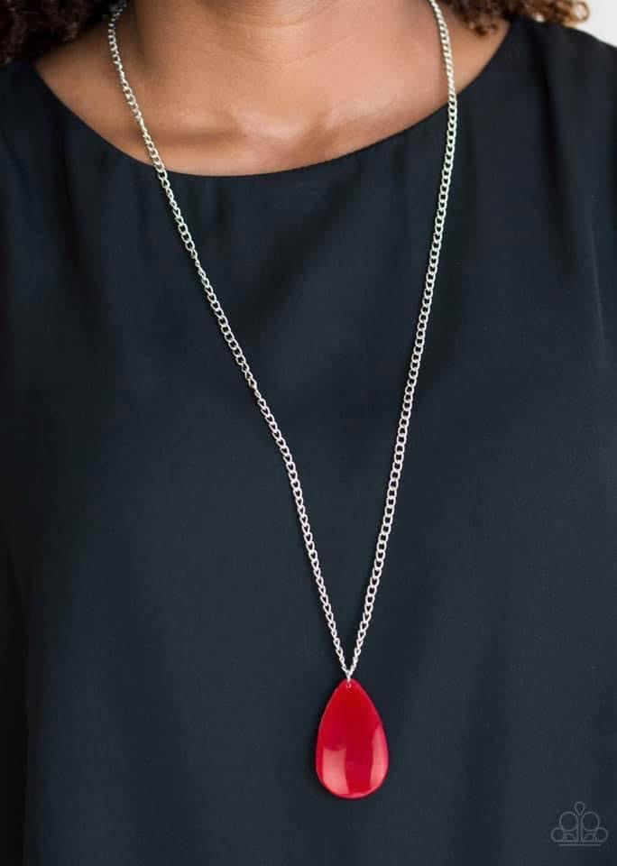 A robust red teardrop pendant swings from the bottom of a lengthened silver chain, adding a perfect pop of color to any outfit. Features an adjustable clasp closure.